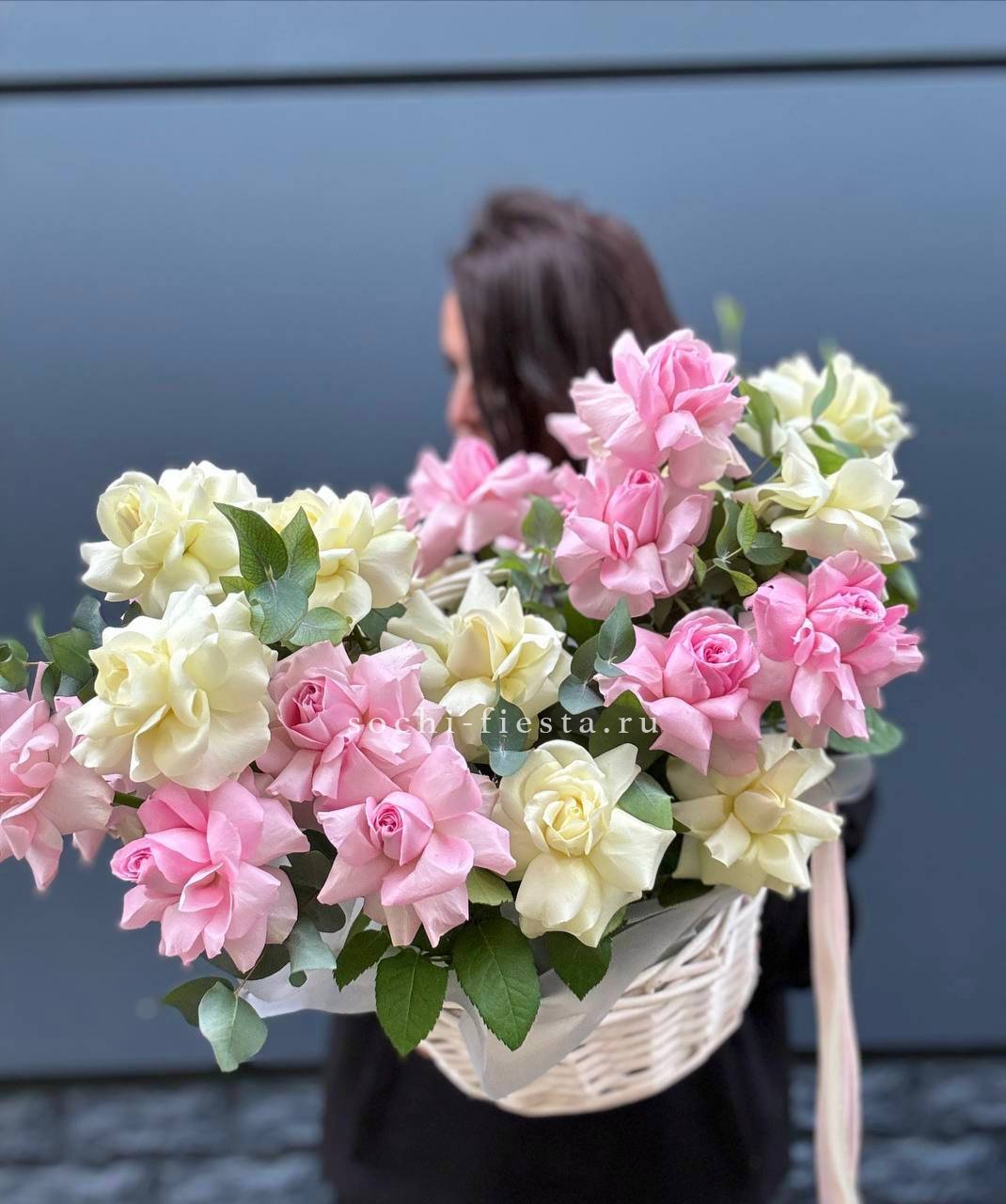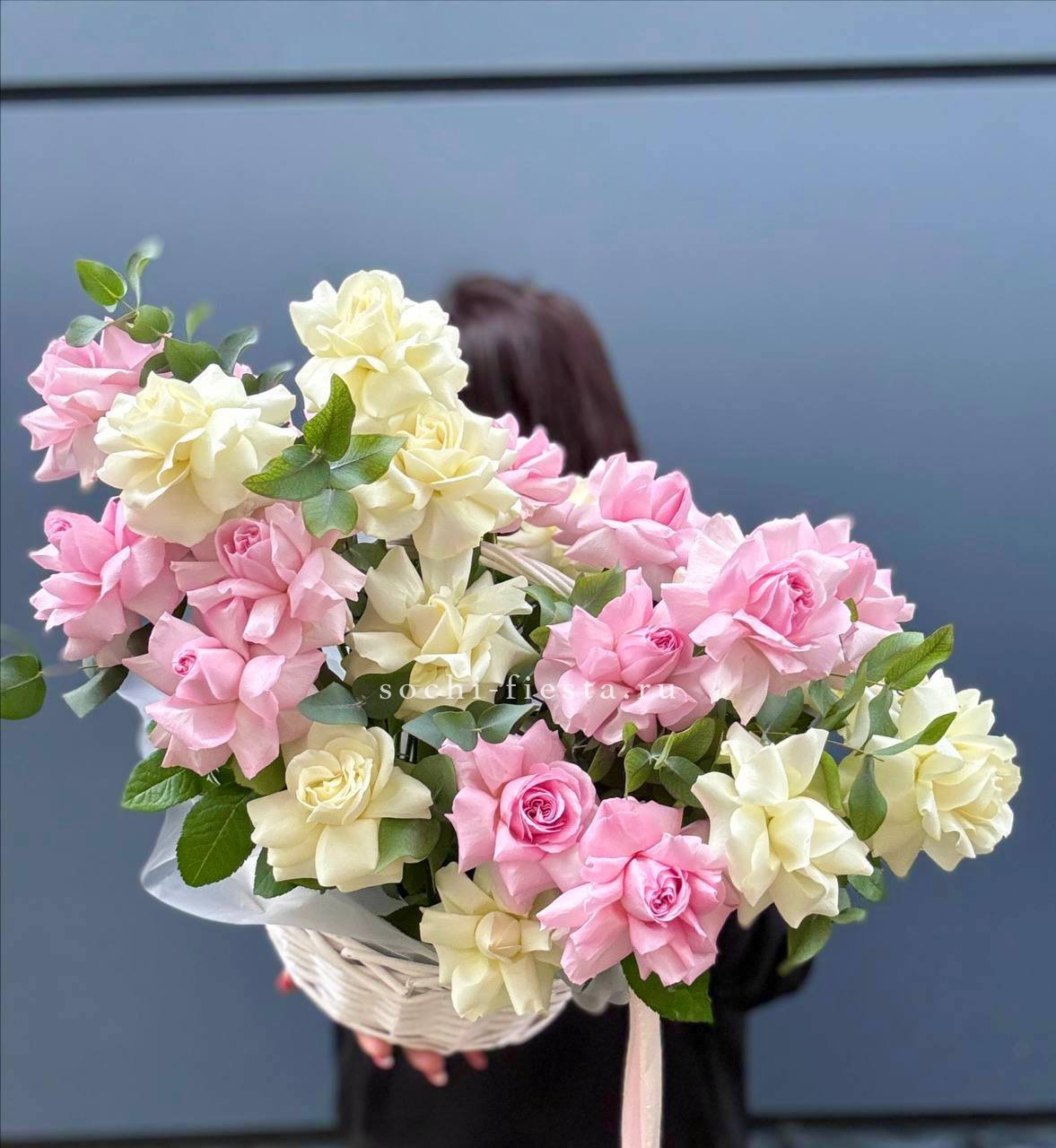 Сто один бутон кенийского пионовидного сорта собраны в масштабную композицию. Белая окантовка лепестков переходит в розовый центр. Впечатляющее присутствие в любом пространстве.