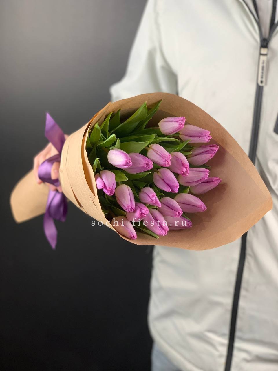 19 розовых тюльпанов, лента, крафт.
