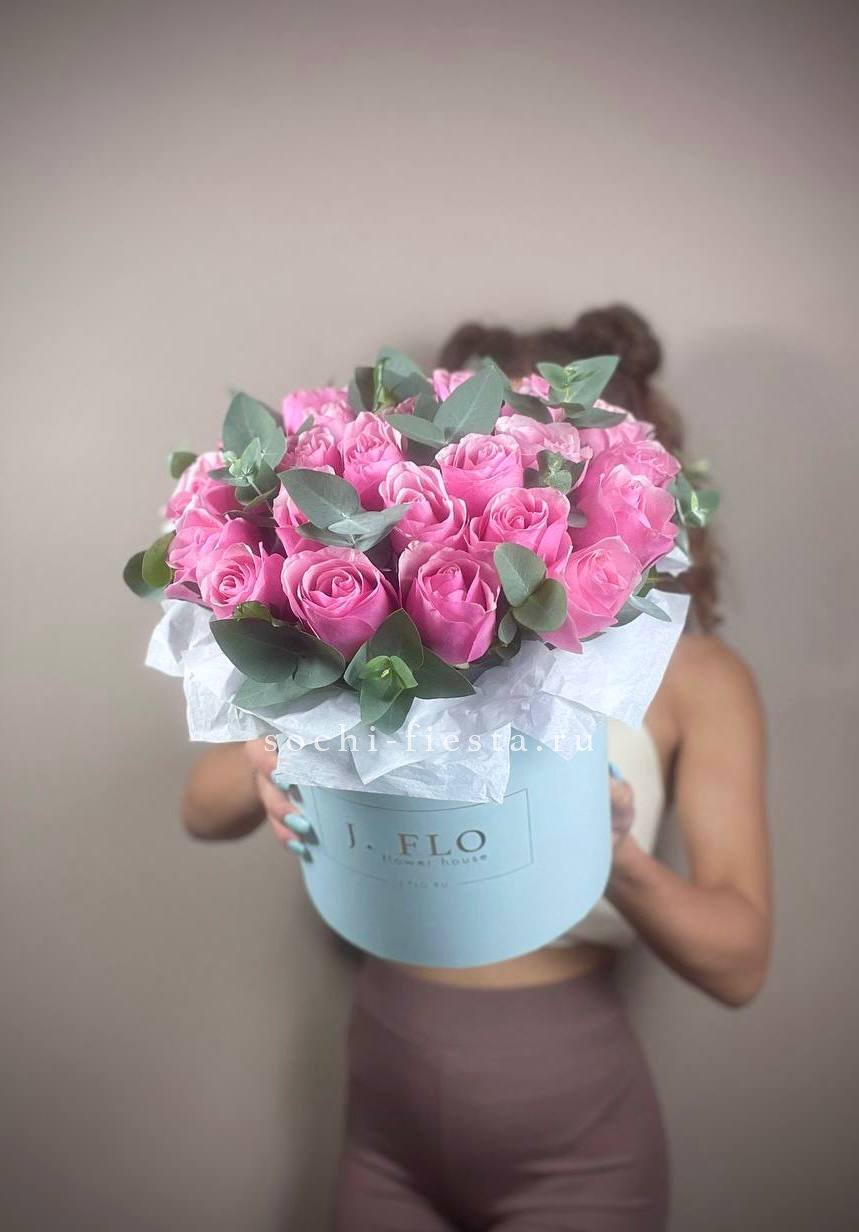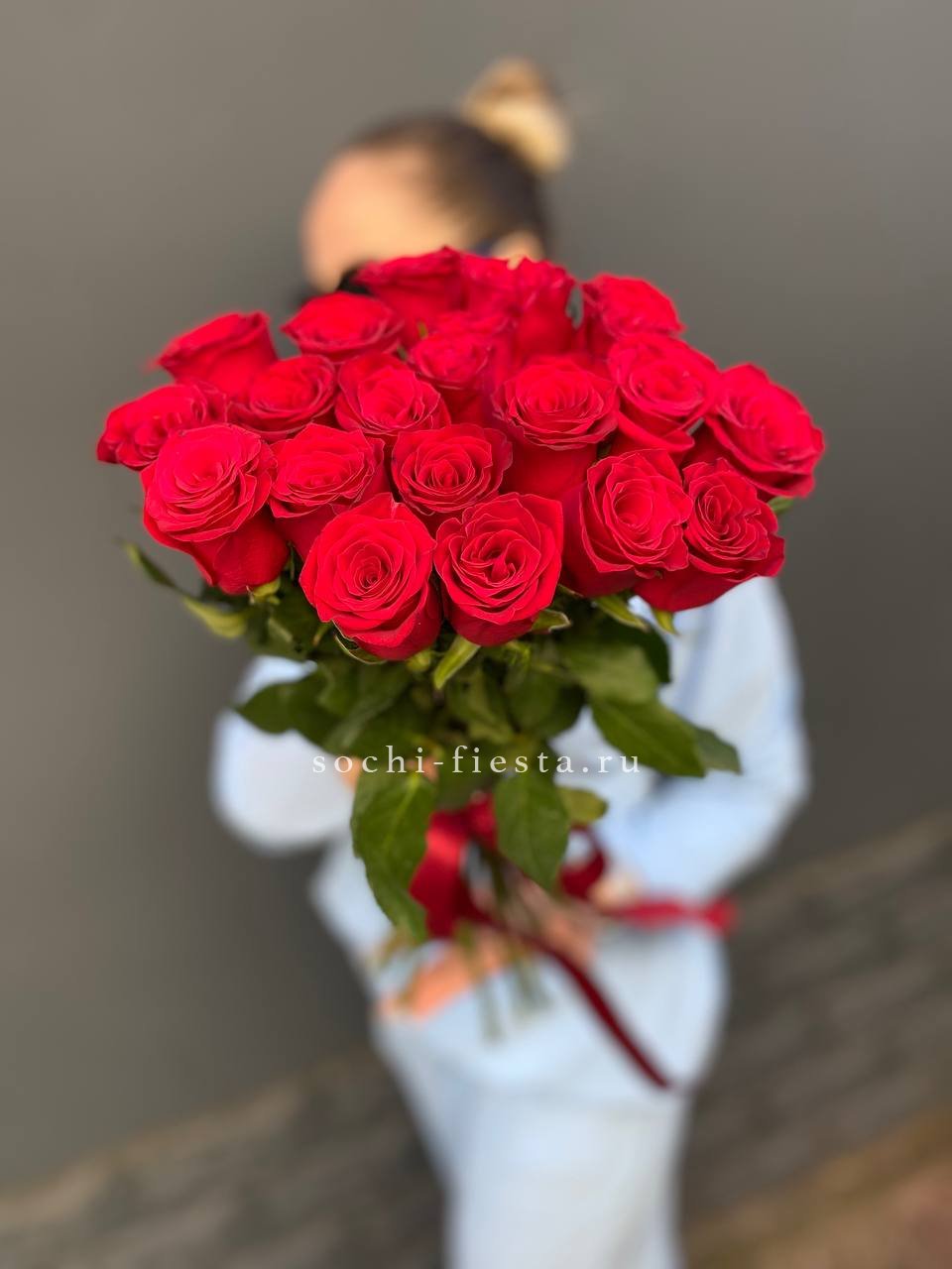 Двадцать одна роза глубокого красного оттенка собрана в плотную композицию с бордовым амарантом и натуральными сухоцветами. Насыщенность цвета создает выразительный образ, а округлая коробка сохраняет форму и свежесть бутонов надолго.