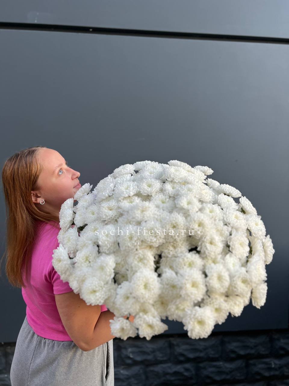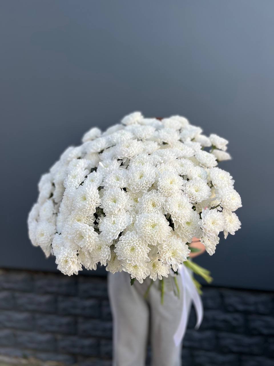 Белоснежные шапки кустовой хризантемы собраны в пышный монобукет, который наполняет пространство свежестью и создает праздничное настроение на любом событии.