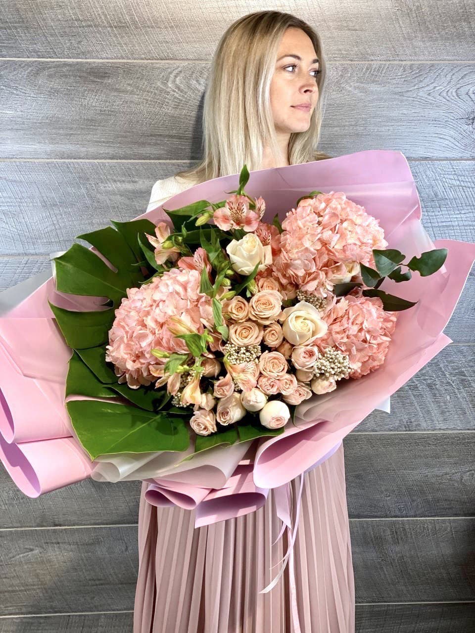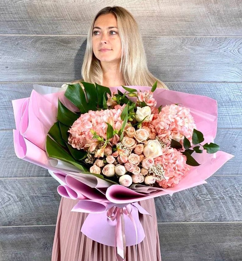 гортензия, вывернутые розы, диантус, кустовая роза, диантусы, оформление в боксе.