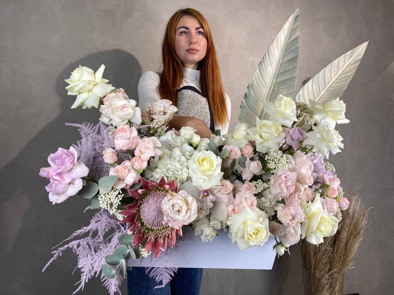 гортензия, розы, протея, озотамнус, орхидея, пионовидные кустовые розы различных сортов, эустома, листья стрелиции (или аналог), аспарагус, эвкалипт, деревянный бокс Готовая композиция может иметь незначительные внешние отличия от примера на фотографии, вместе с тем, сохранит гамму и фактуру.