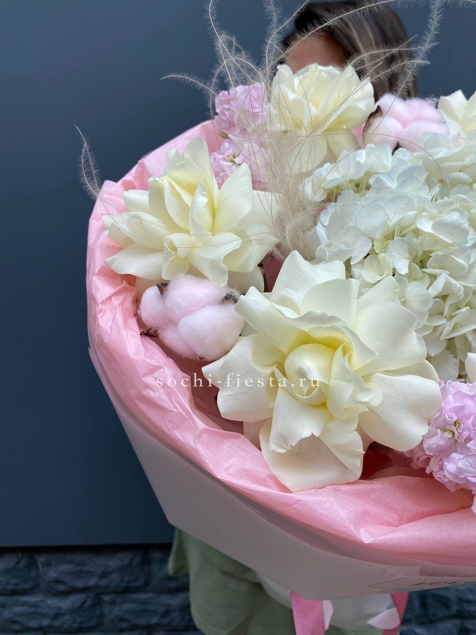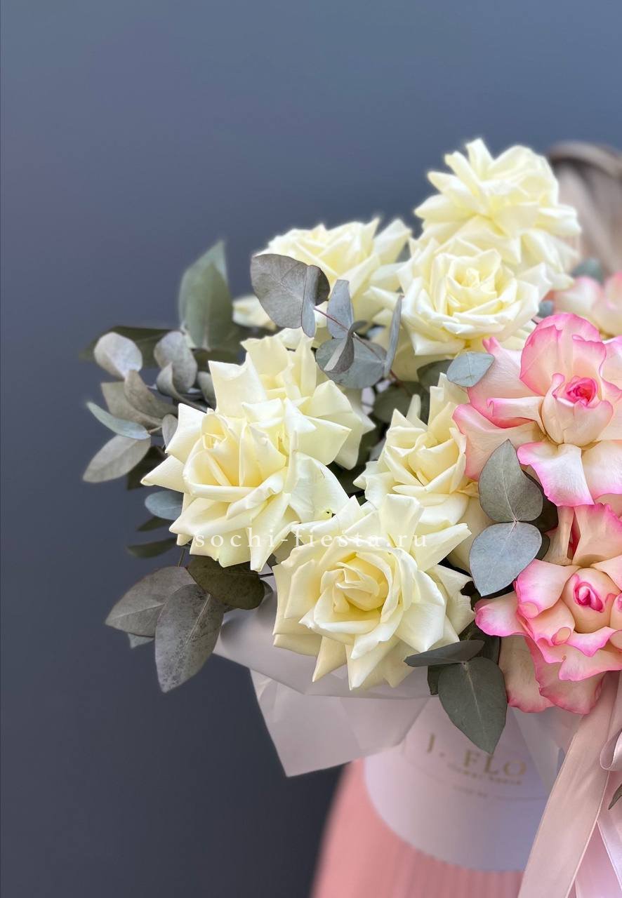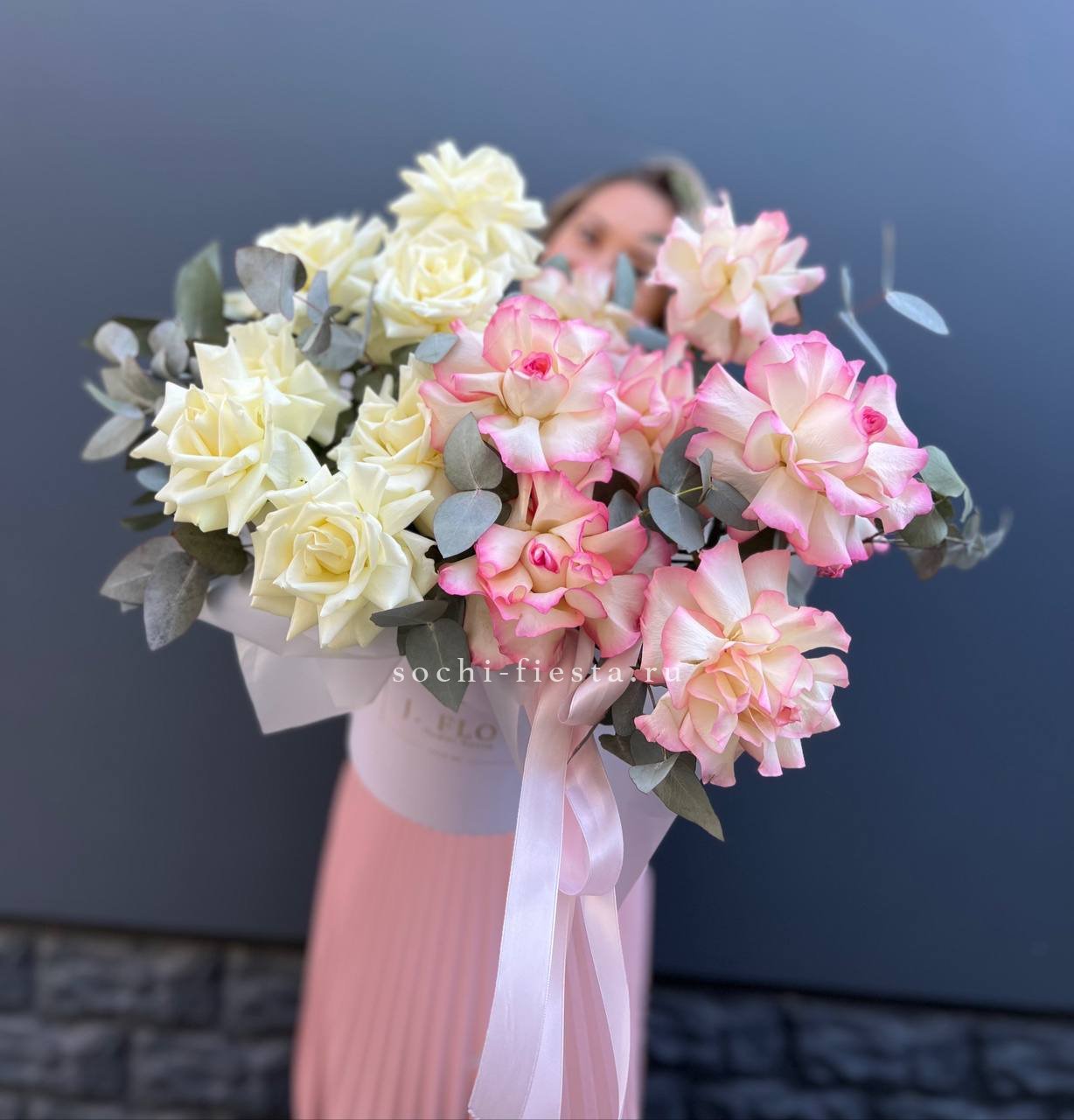 Настоящий цветочный фейерверк в стильной коробке! Эта пышная и многосоставная композиция притягивает взгляды богатством форм и оттенков — от кремового и персикового до насыщенного розового и белого. Это не просто цветы, а целая история о радости, празднике и восхищении. Подарок, который гарантированно произведет яркое впечатление и останется в памяти надолго.