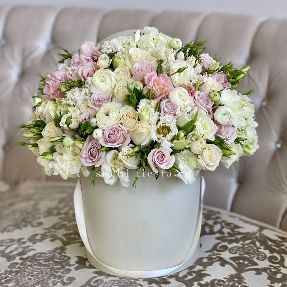 Семь соцветий гортензии раскрываются воздушным облаком с мягкими переходами оттенков. Букет дарит ощущение лёгкости и свежести летнего сада в любое время года.