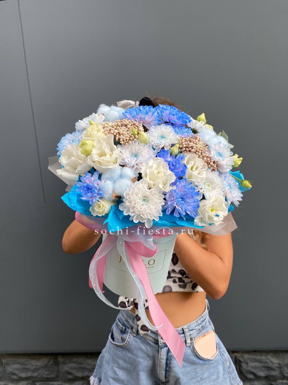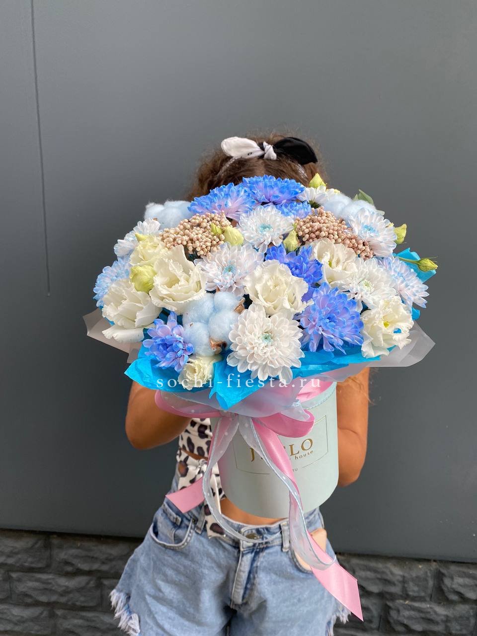 Одиннадцать кустовых хризантем окрашены в холодный голубой оттенок и собраны в плотную композицию. Каждая ветка раскрывается множеством бутонов, создавая объёмную шапку цвета зимнего неба.