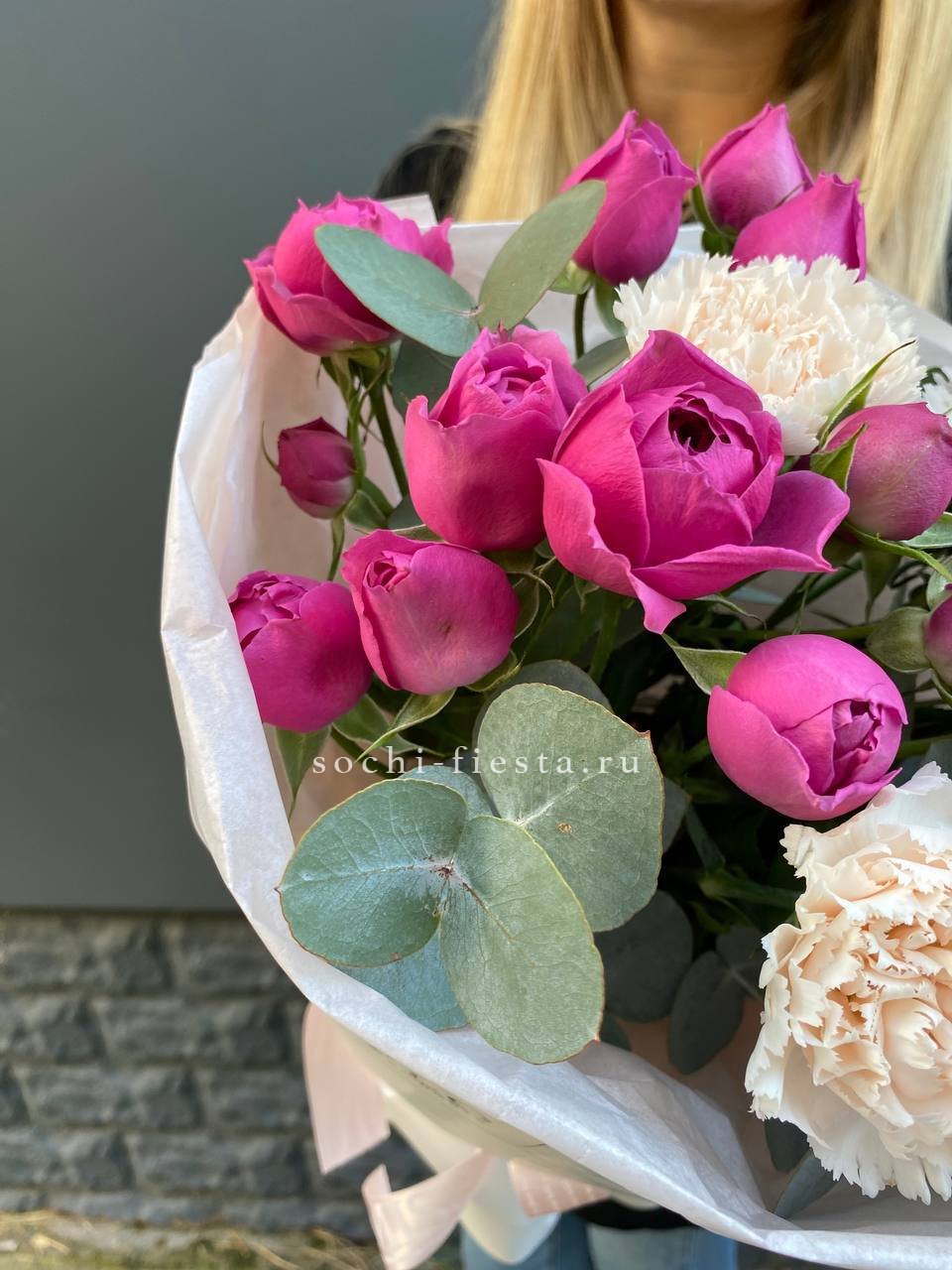 Воздушные кисти мисти бабблс переплетаются с яркими диантусами создавая объёмную текстуру. Эвкалипт добавляет свежести и завершает композицию лёгкими зелёными нотами.