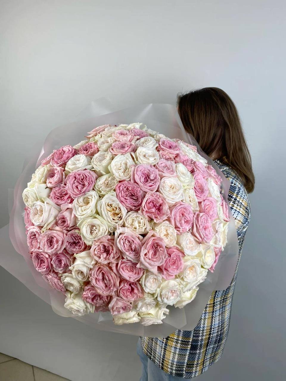 пионовидные розы, розовые розы, эвкалипт, лента, дизайнерская упаковка.