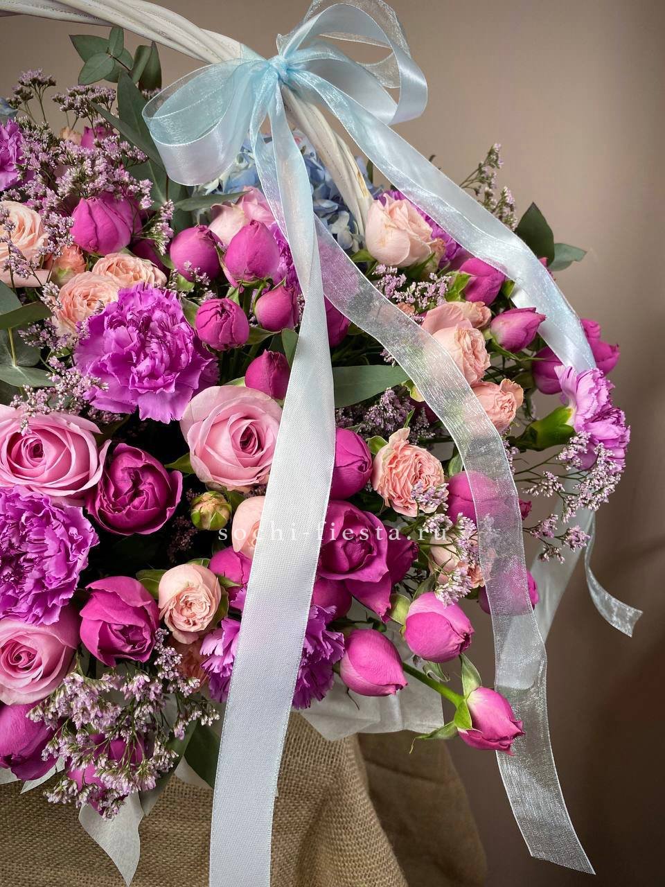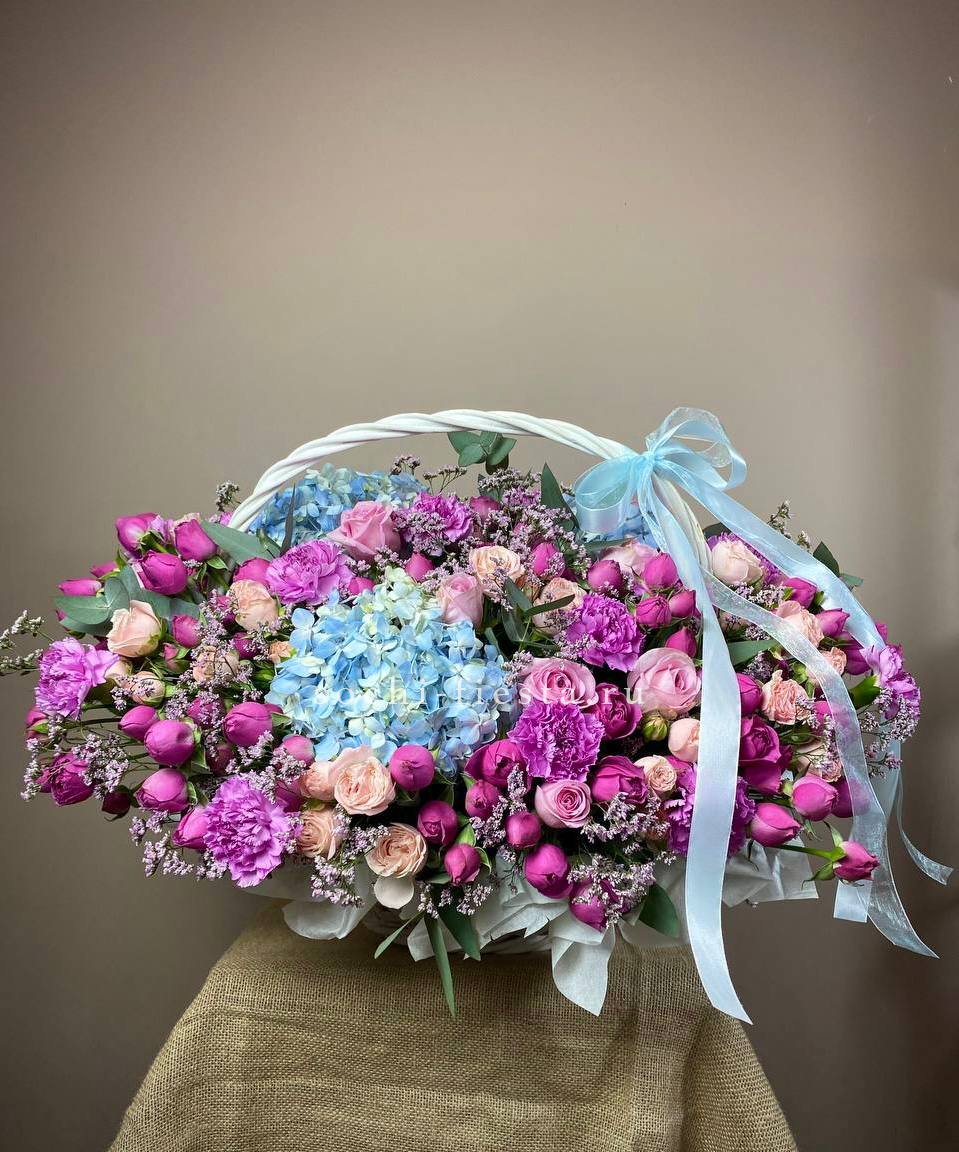 Пышная гортензия обволакивает кустовые розы Мисти Баблс, создавая плотную текстуру с переходами от ягодного к лавандовому. Каждый бутон раскрыт по-своему, образуя живую композицию с глубиной и объёмом.