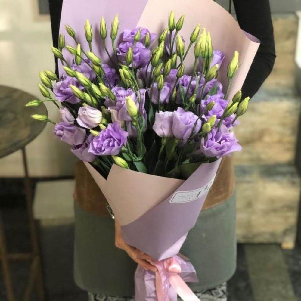 эустома - 5 шт., эвкалипт, лента, дизайнерская упаковка.