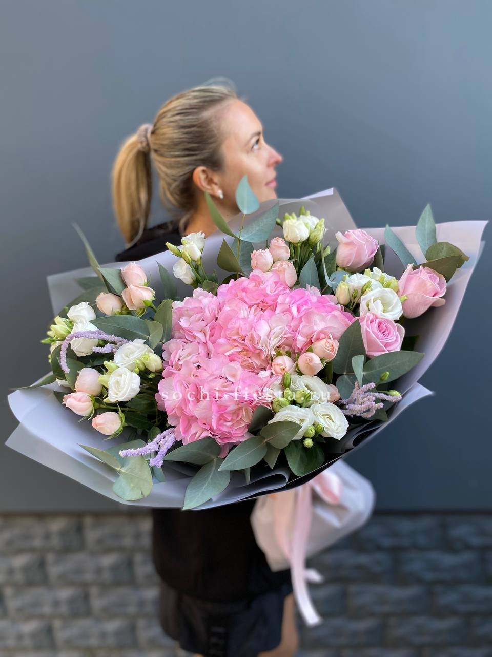 гортензия, бомбастик, диантус, лимониум, лилия, эустома. эвкалипт, корзина малая.