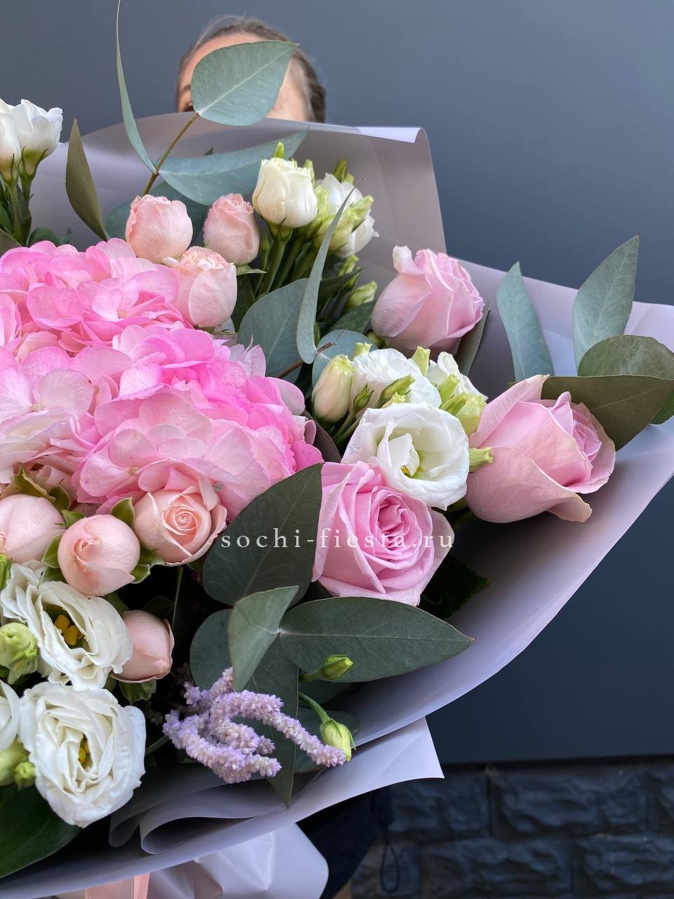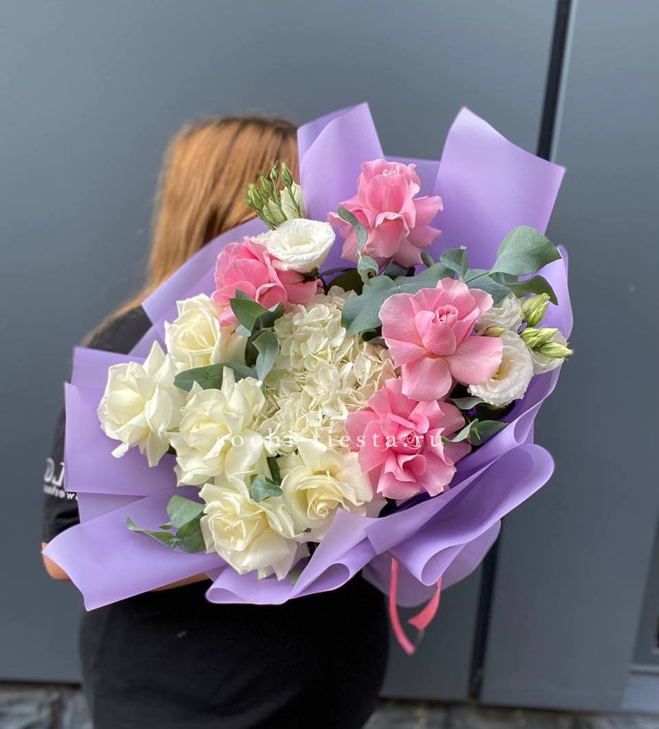 Пышная корзина с лилиями и гортензией собрана так, чтобы каждый цветок был виден и раскрыт. Розовые оттенки бомбастика перетекают в лиловый лимониум, создавая мягкую градацию. Эустома и диантус добавляют воздушности, эвкалипт завершает форму.