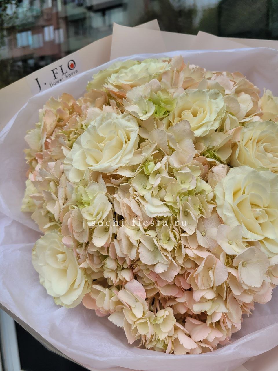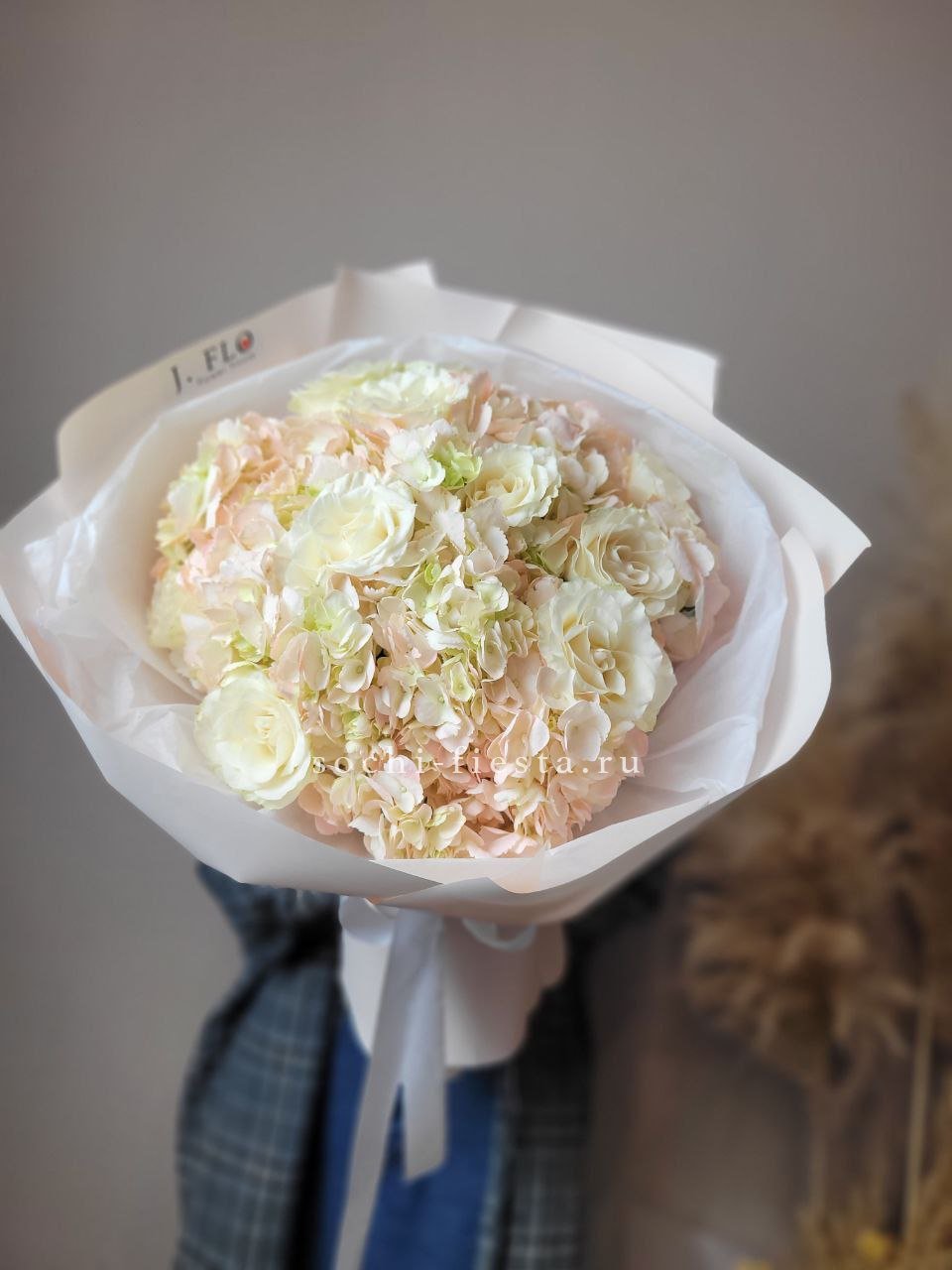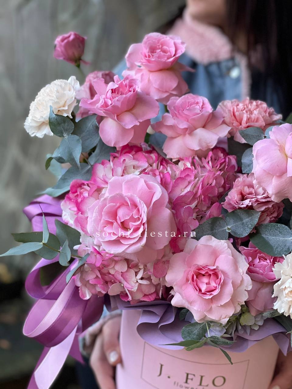 Пышная гортензия задает объем, а французские розы и эустома создают многослойную глубину. Диантусы добавляют графичные точки, эвкалипт обрамляет композицию мягкими линиями.