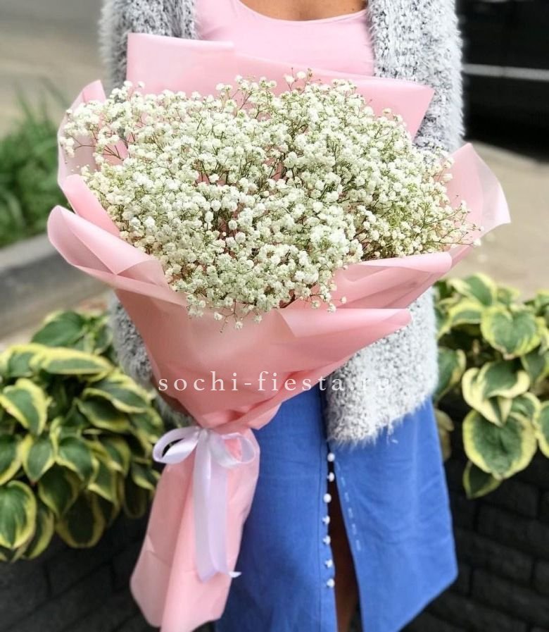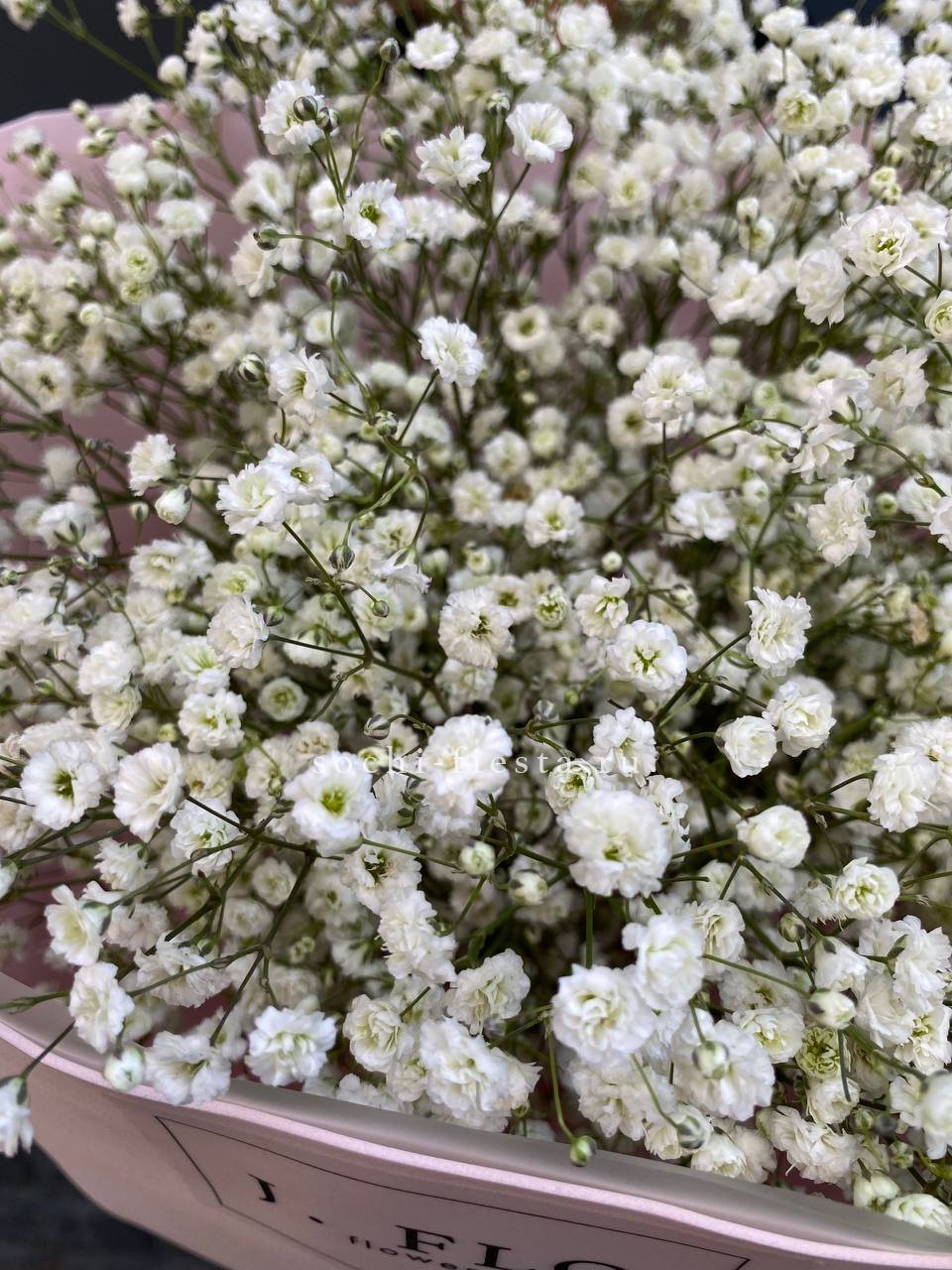 Семь веток голландской гипсофилы с россыпью мелких бутонов в воздушной композиции. Белоснежные соцветия создают ощущение простора и спокойствия.