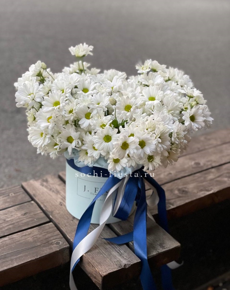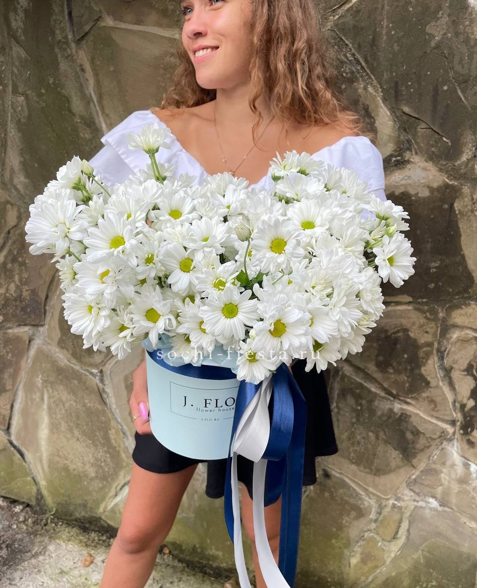 Семь пышных соцветий хризантемы с игривыми завитыми лепестками собраны в плотную композицию. Золотистый эвкалипт добавляет теплое мерцание и завершает образ. Яркий жест для тех, кто любит выразительные формы и живую энергию цветов.