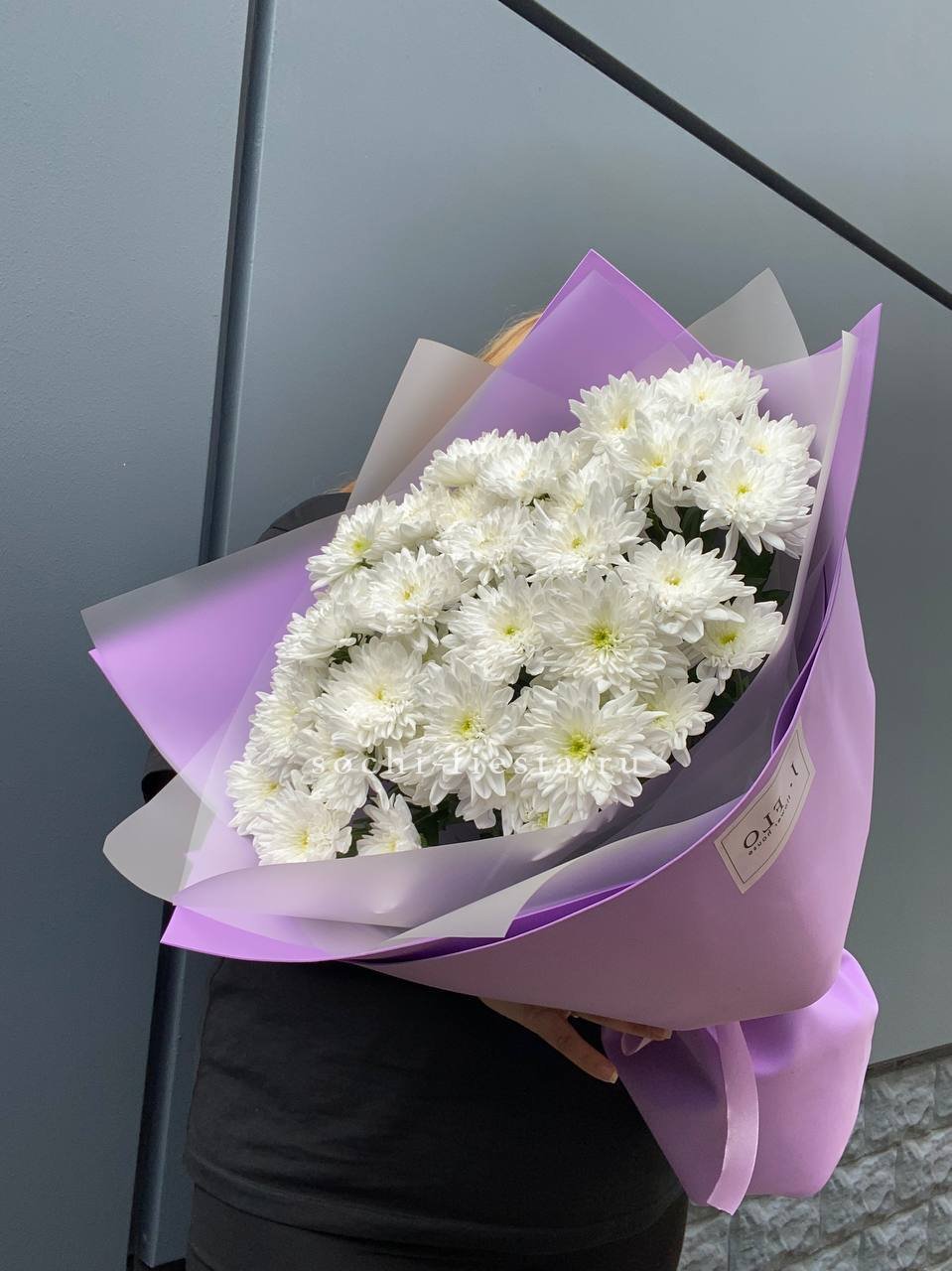 Девять хризантем бигуди выстраиваются в воздушную композицию с игольчатыми лепестками. Каждый бутон раскрывается лучистой звездой, создавая объёмную фактуру и динамичный силуэт.