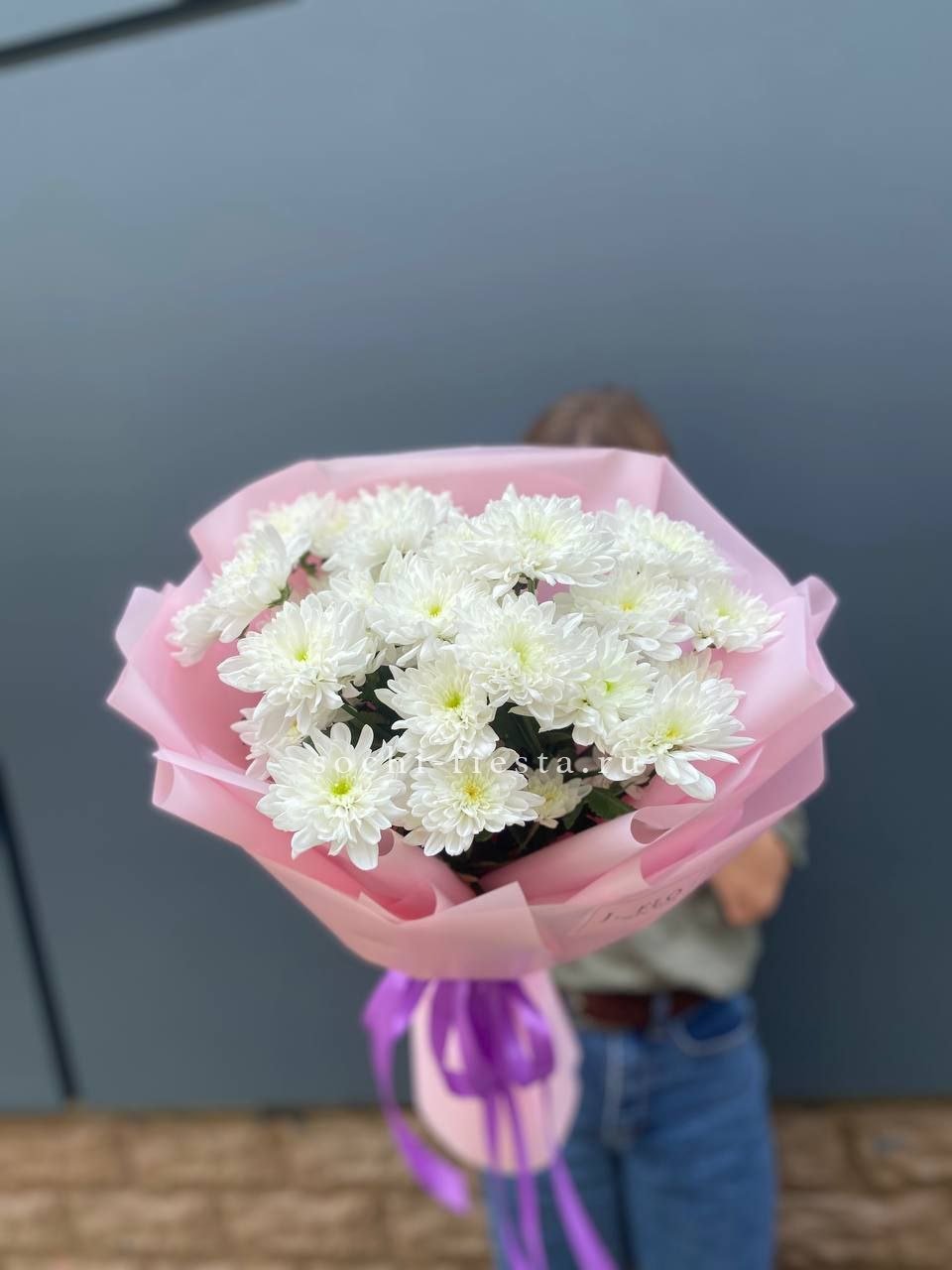 Пять веток кустовой хризантемы с множеством соцветий создают пышную воздушную массу. Букет напоминает утренний сад, где каждая ветка живёт своим ритмом и дарит ощущение лёгкости.