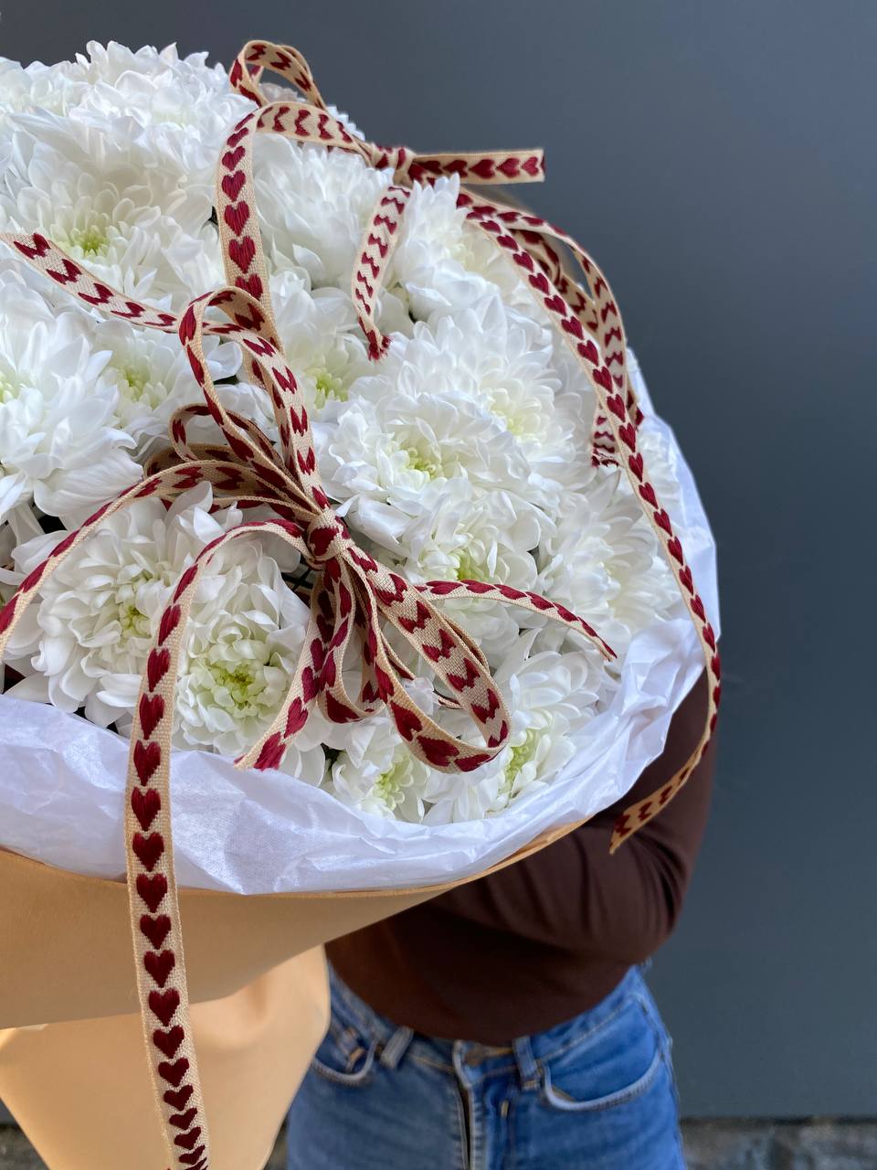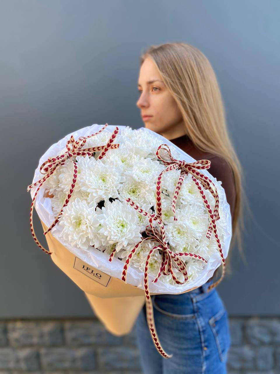 Двадцать одна ветка кустовой хризантемы в естественной подаче без лишнего декора. Простая форма и свежесть соцветий делают композицию универсальной для любого интерьера.