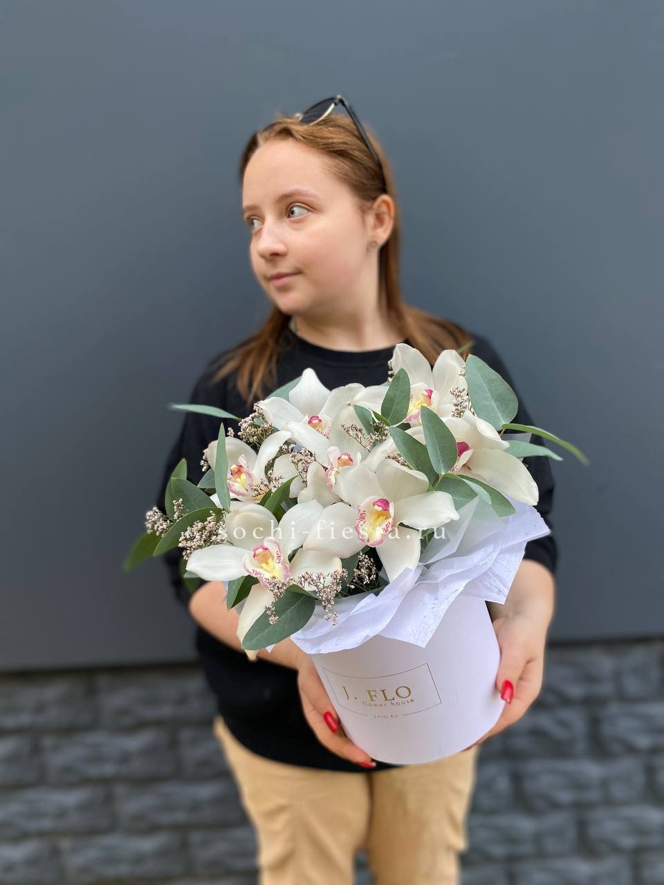 Цимбидиум в круглом боксе дополнен лимониумом и эвкалиптом. Композиция компактна, держит форму и долго сохраняет свежий вид.