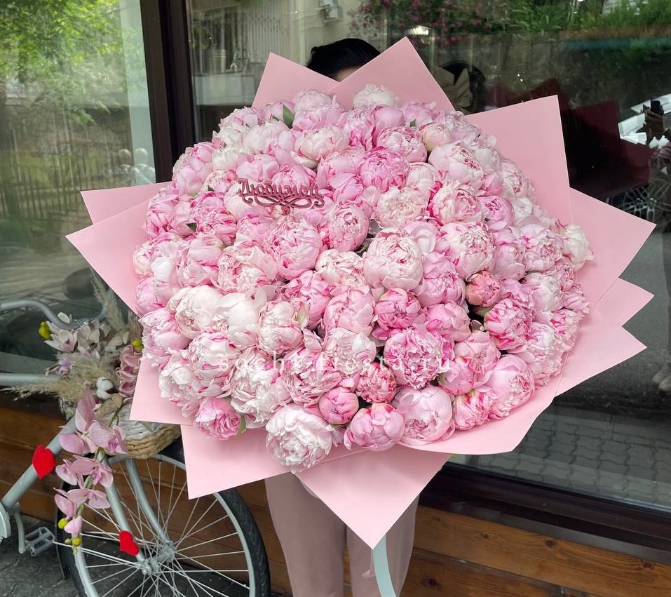 101 пион Сара бернар, топпер Любимой; (можно на выбор), лента, дизайнерская упаковка.