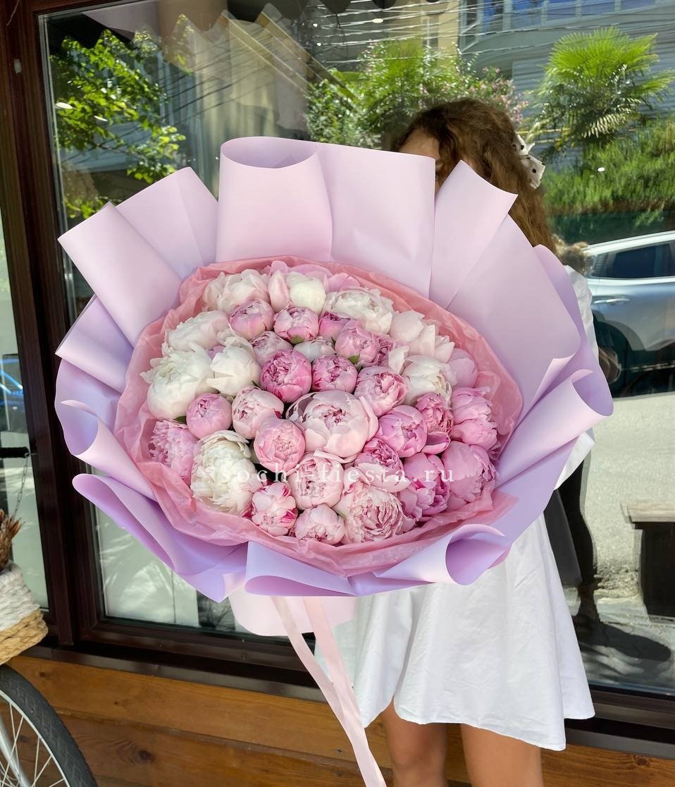 пион 51 шт., лента, дизайнерская упаковка комбинированная.