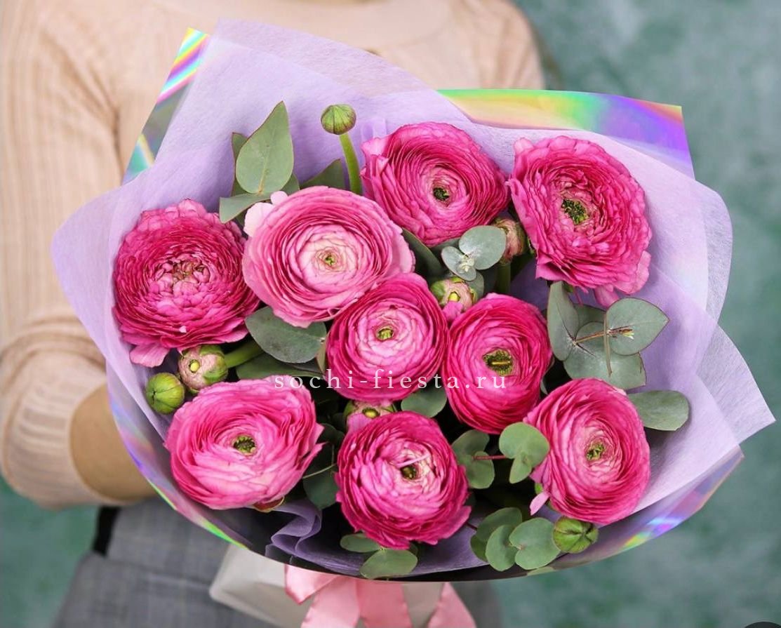 9 ранункулюсов, эвкалипт, лента, дизайнерская пленка комбинированная.