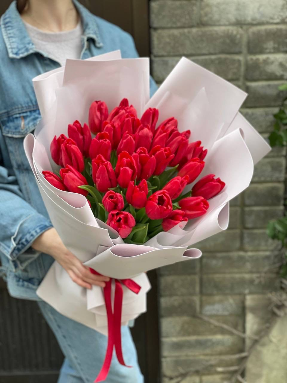 Пятьдесят один белоснежный тюльпан собран в плотный монохромный букет с мягкими соцветиями лагуруса. Чистая графика весенних бутонов создает ощущение свежести и простора.