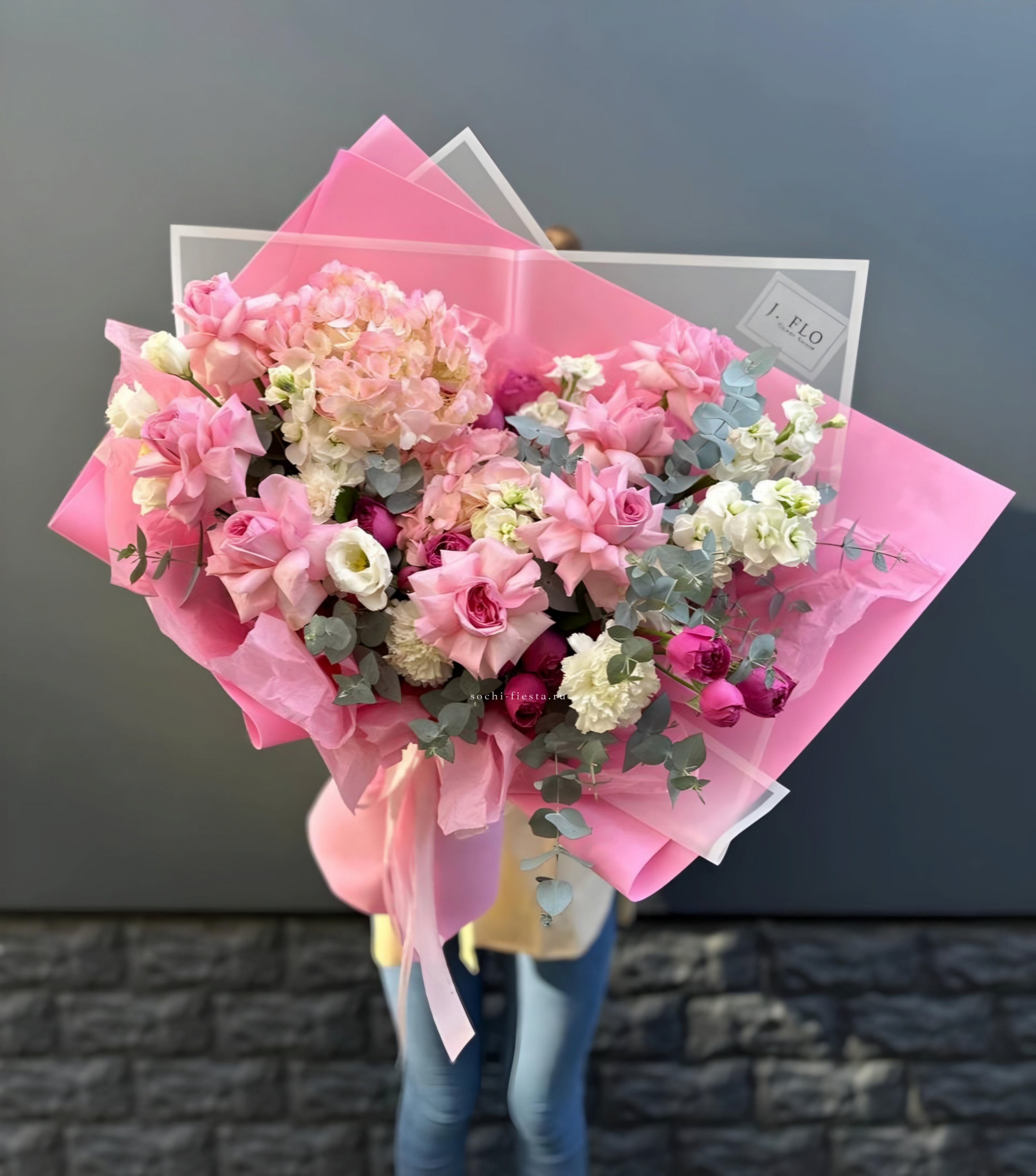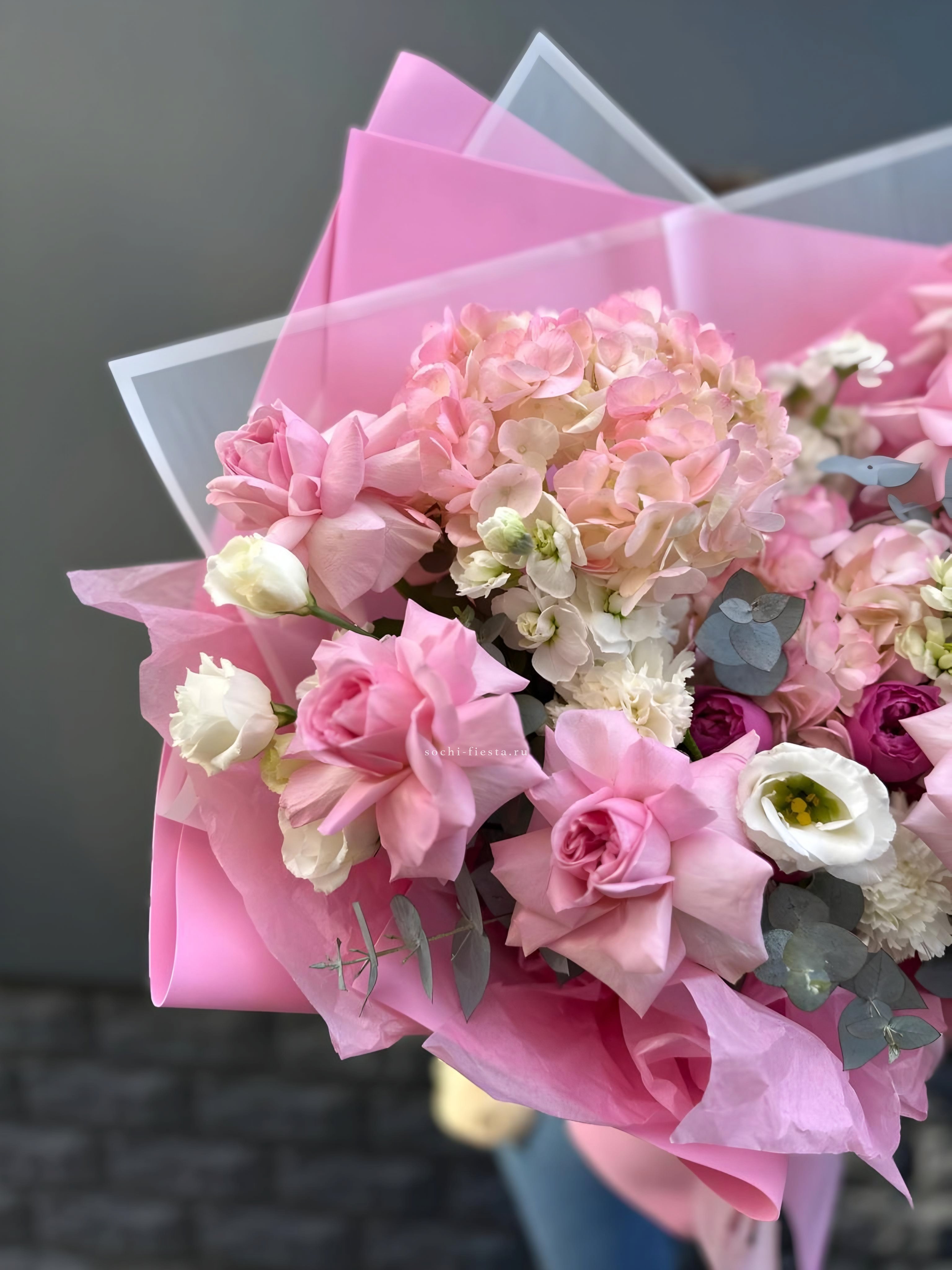 гортензия, бруния, диантусы (или эустома), пионовидная кустовая роза, эвкалипт, дизайнерское оформление.