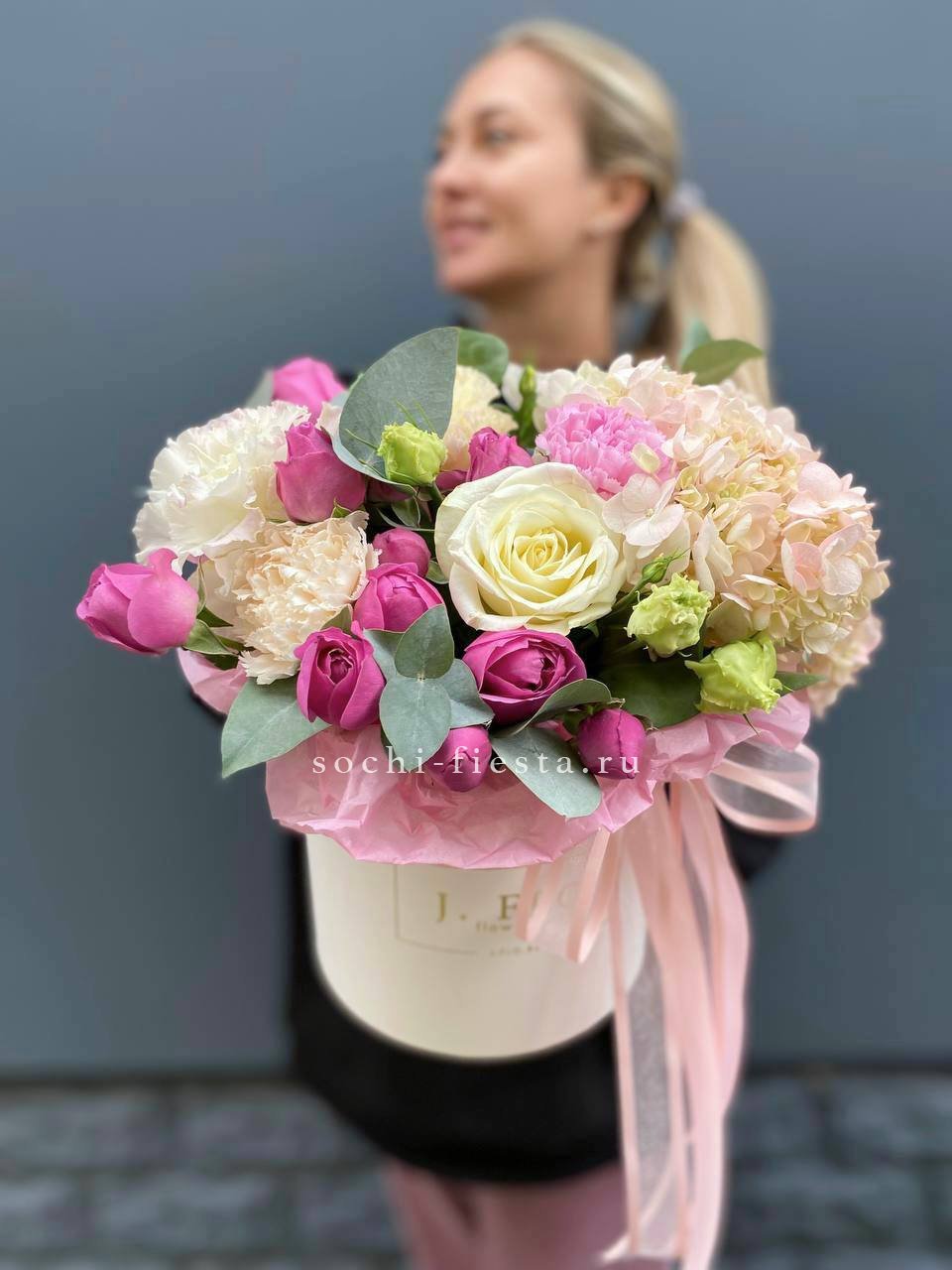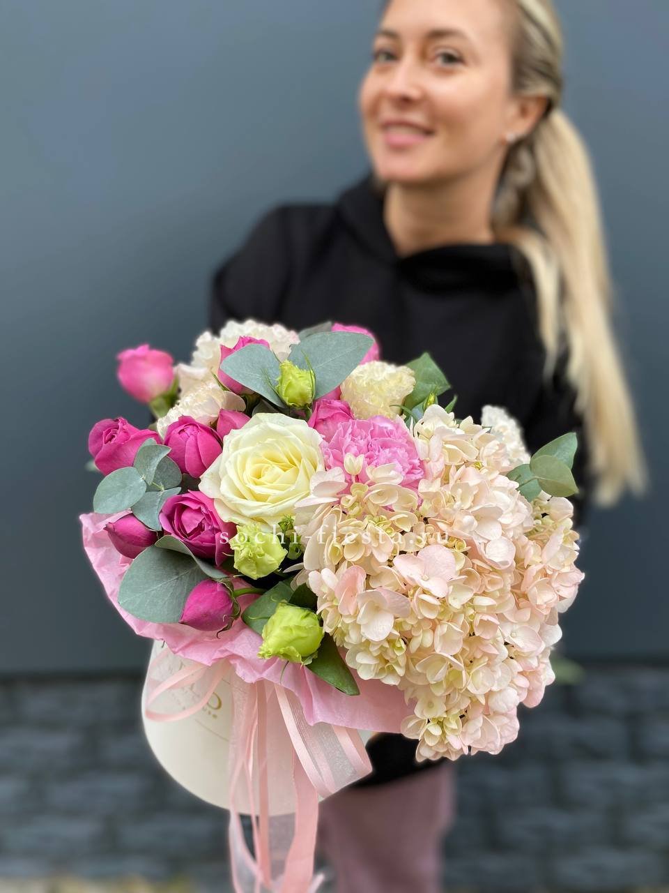 гортензия, розы одноголовые, кустовые розы, вероника (аналог вне сезона), маттиола (аналог вне сезона), эвкалипт, лента, дизайнерская упаковка.