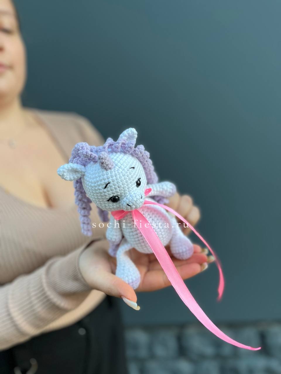 на фотографии единорог, ручное плетение. Доставка данной товарной единицы бесплатна при условии её заказа с цветами.