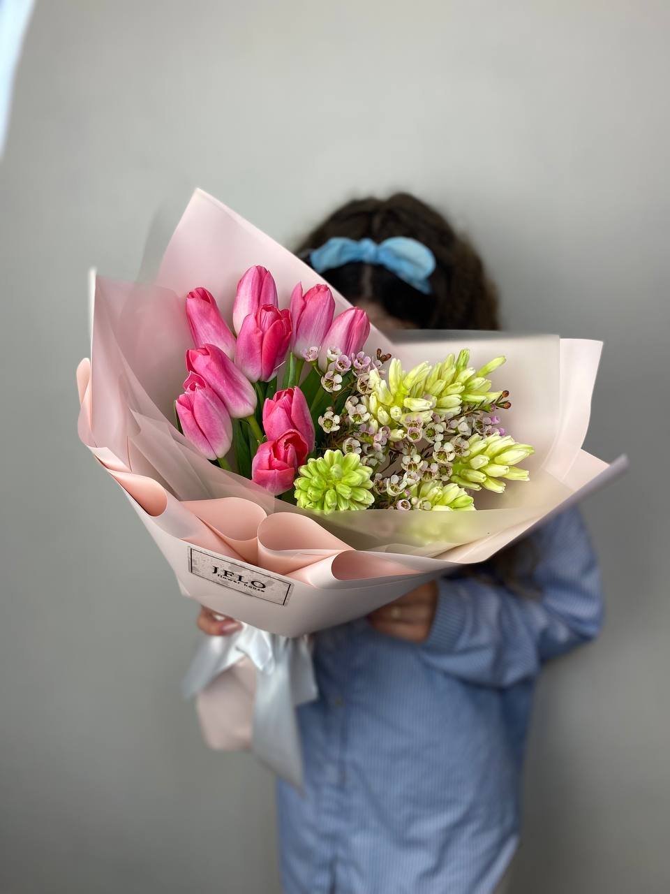 Весенний дуэт тюльпанов и гиацинтов собран в плотную композицию с воздушными веточками хамелациума. Бутоны раскрываются постепенно, наполняя пространство свежим ароматом и яркими красками. Букет сохраняет форму и радует несколько дней подряд.