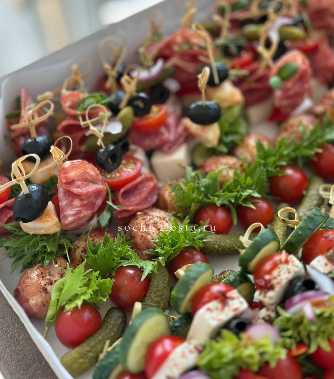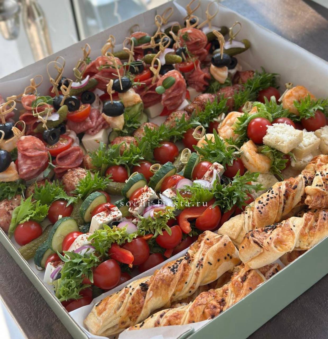 Шестнадцать брускетт с мясными и рыбными начинками. Говядина с вялеными томатами, паштет из печени, семга с огурцом и карбонад с черри раскрывают богатство вкусов в одной подаче.