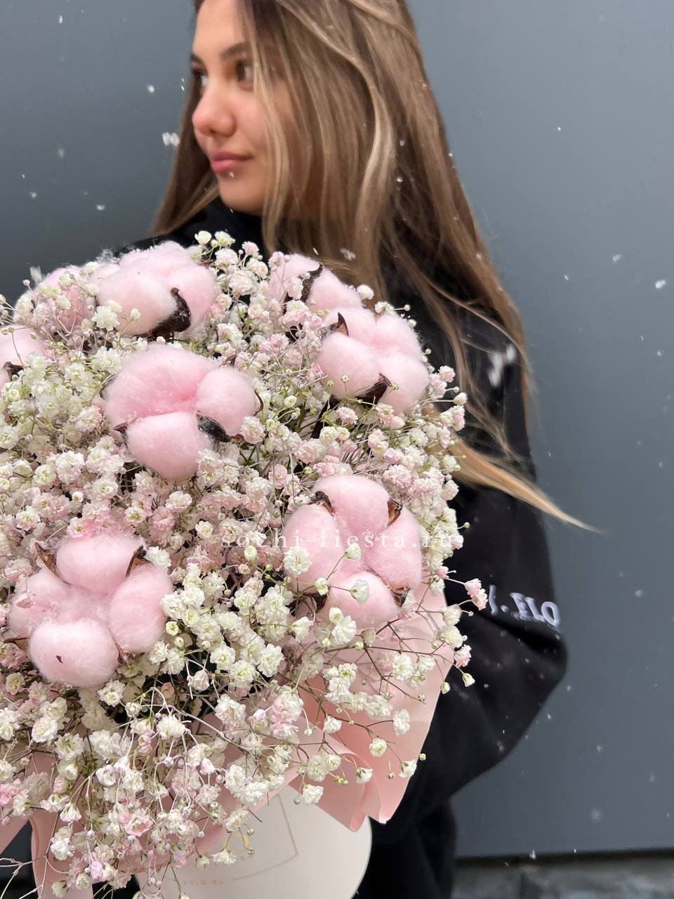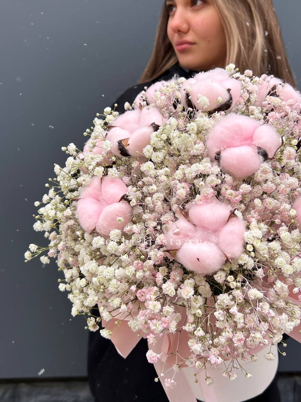 Радужные гипсофилы рассыпаются облаком вокруг хлопковых коробочек. Лёгкая воздушная масса создаёт ощущение утреннего сада после дождя.