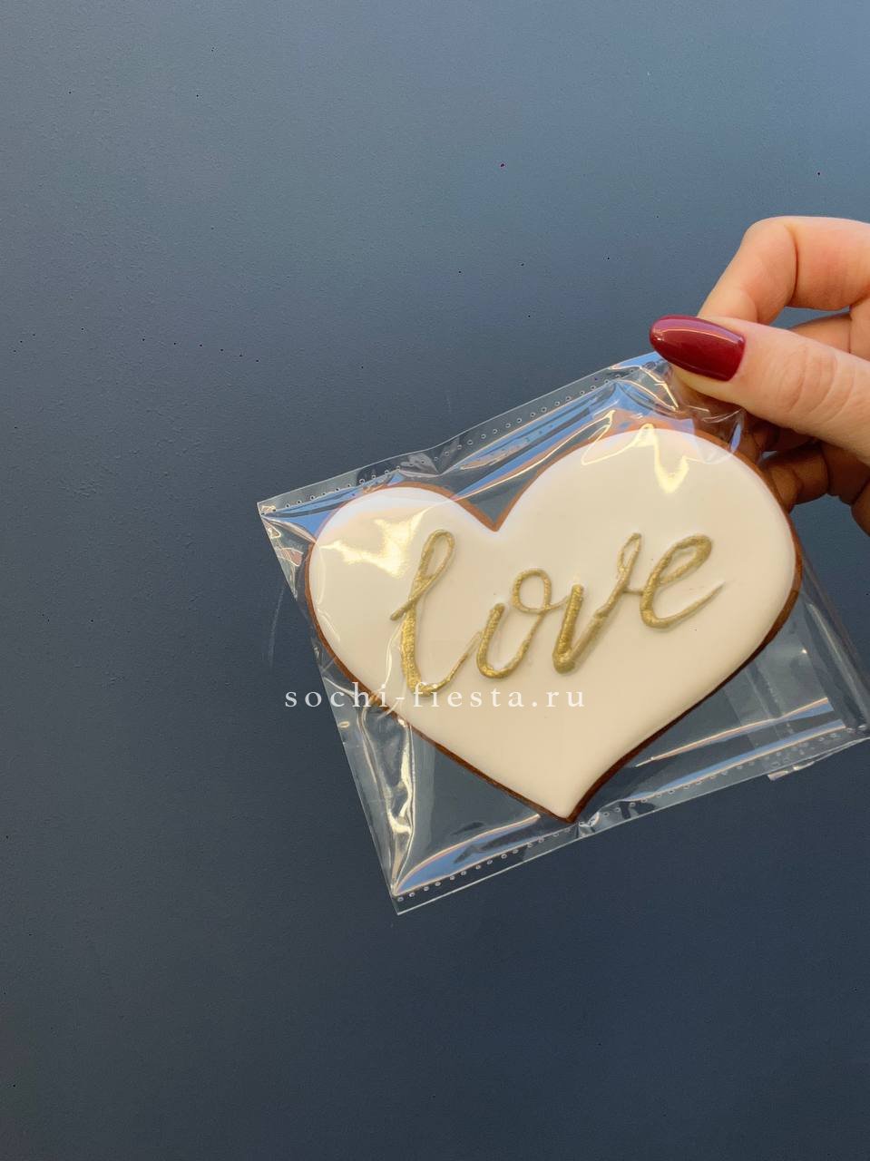 Пряник с ручной росписью готов дополнить цветочную композицию. Каждый рисунок уникален, а сама форма держит четкие края и аккуратные линии глазури.