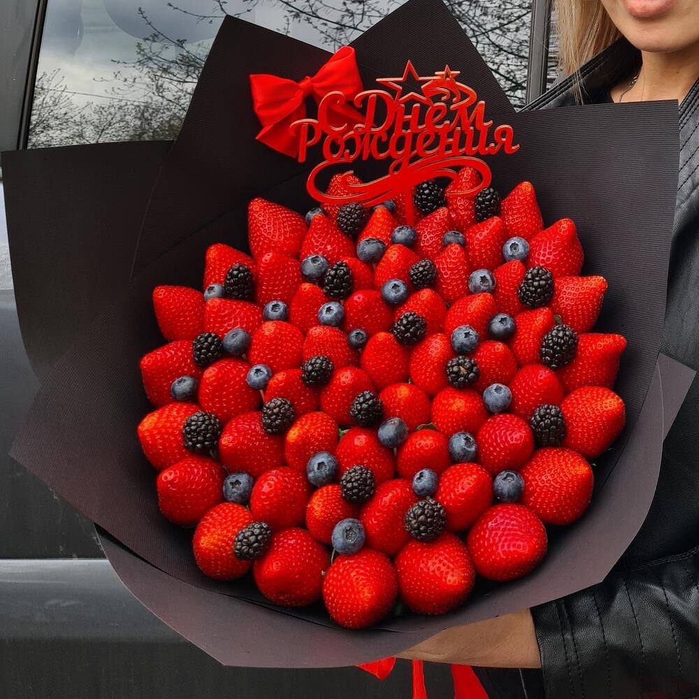Килограмм спелой клубники соседствует с тёмными ягодами голубики или ежевики. Композиция собрана плотно и держит форму за счёт ленты и продуманного оформления.