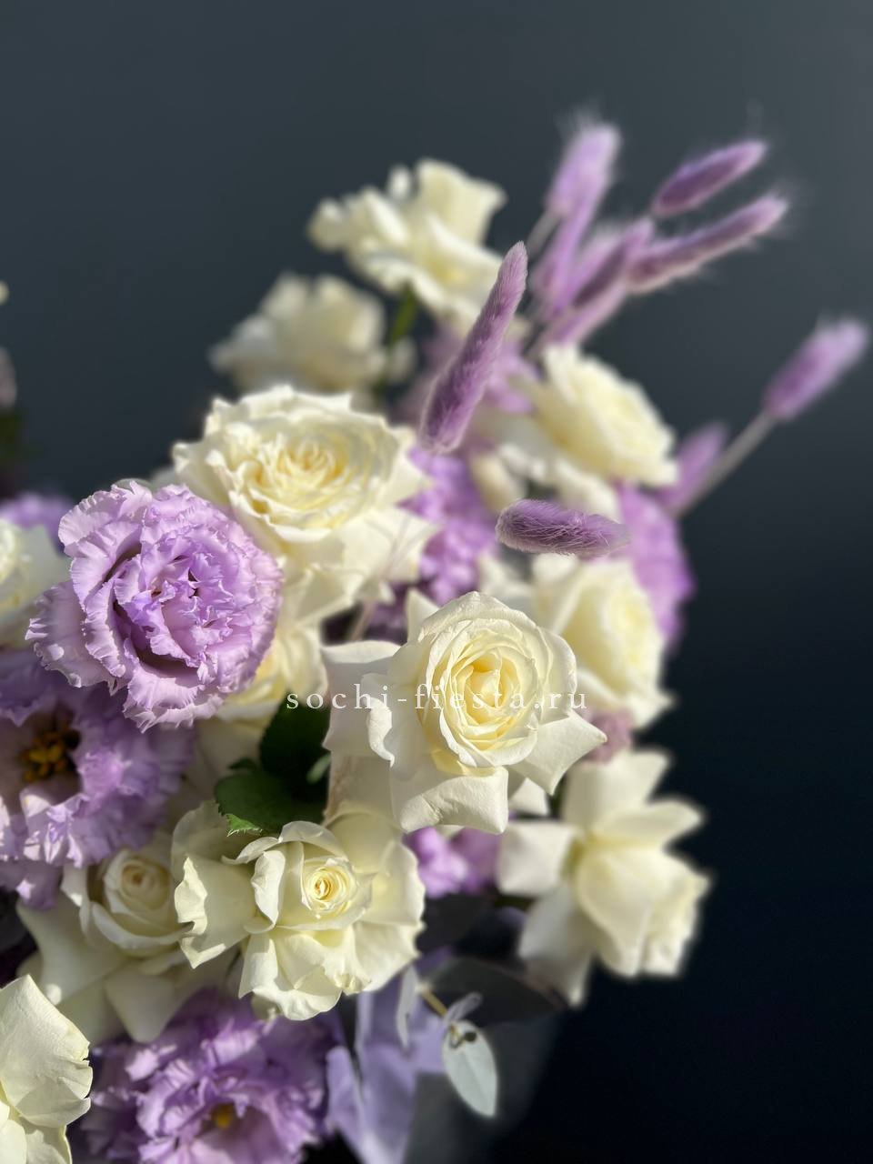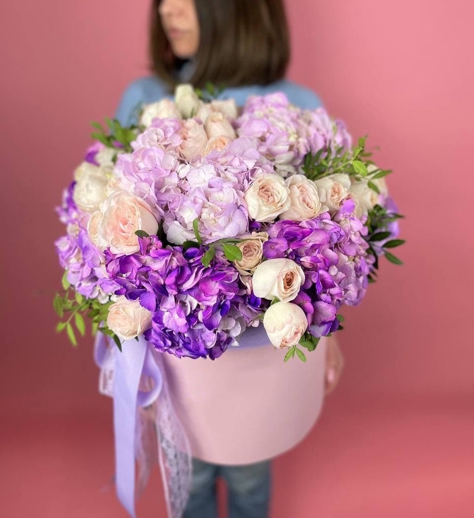 Белоснежные розы и воздушная эустома соседствуют с пышной гортензией и яркими вспышками статицы. Композиция собрана плотно, каждый цветок находит своё место в общем ритме.