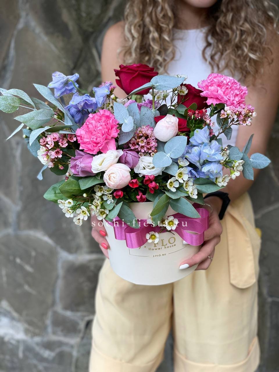 цветочная композиция, выполненная в бежевом цилиндре диаметром 20 см.