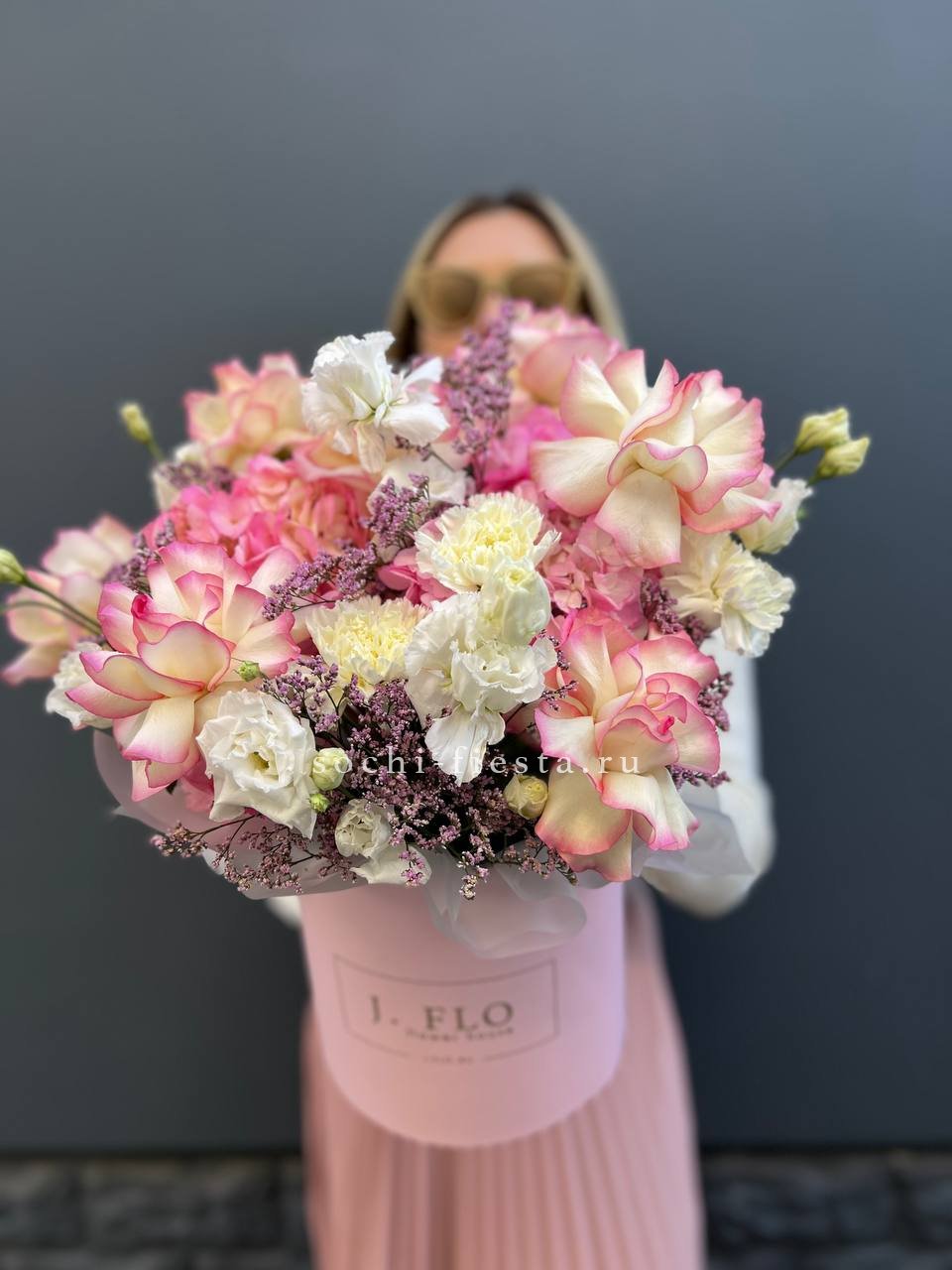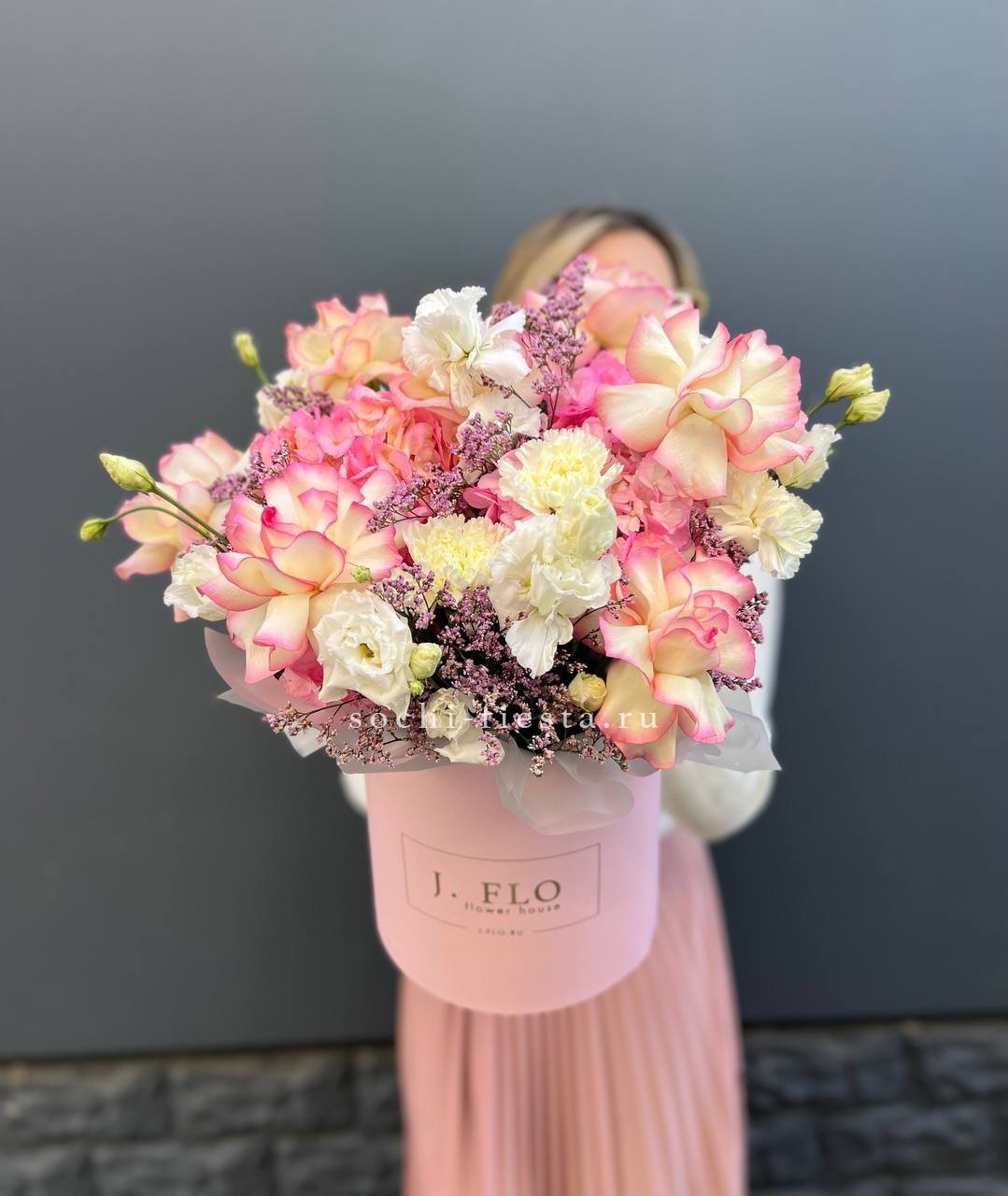 Пионовидные розы раскрываются пышными шапками среди воздушной гортензии и эустомы. Композиция собрана в круглом боксе и держит форму без дополнительной упаковки.