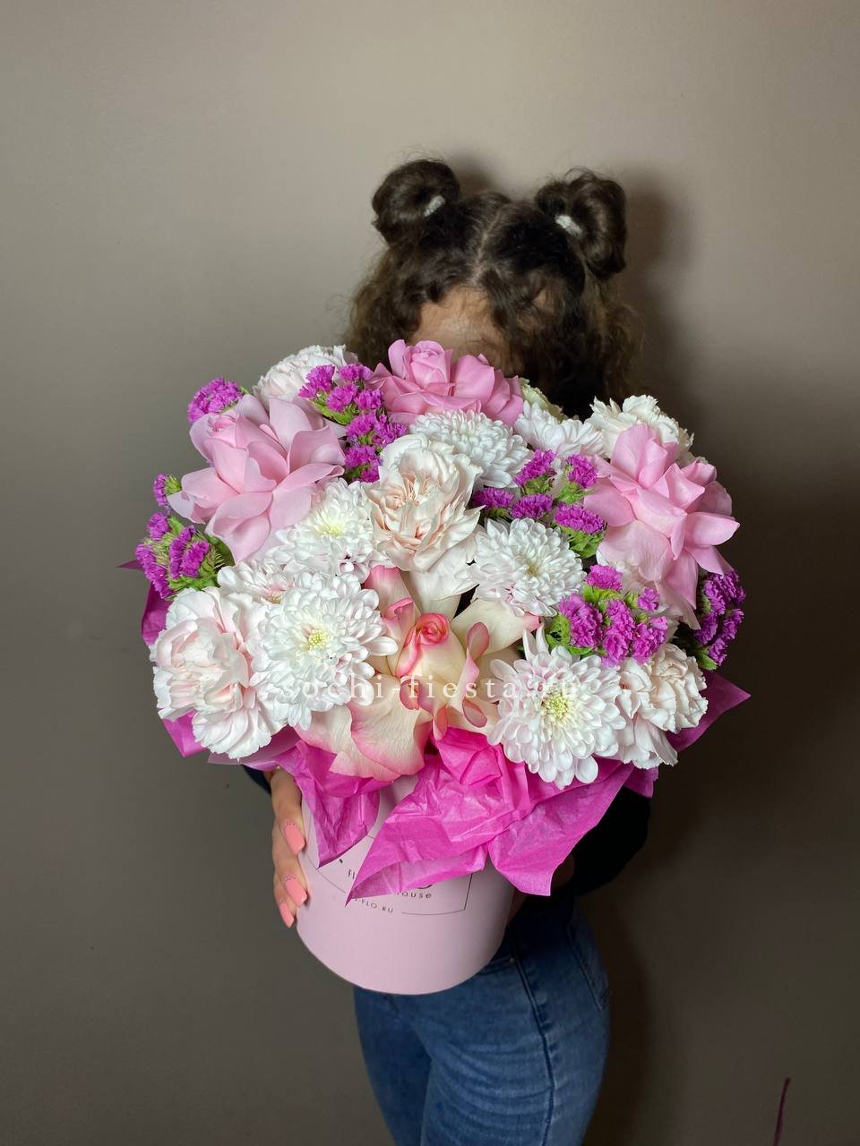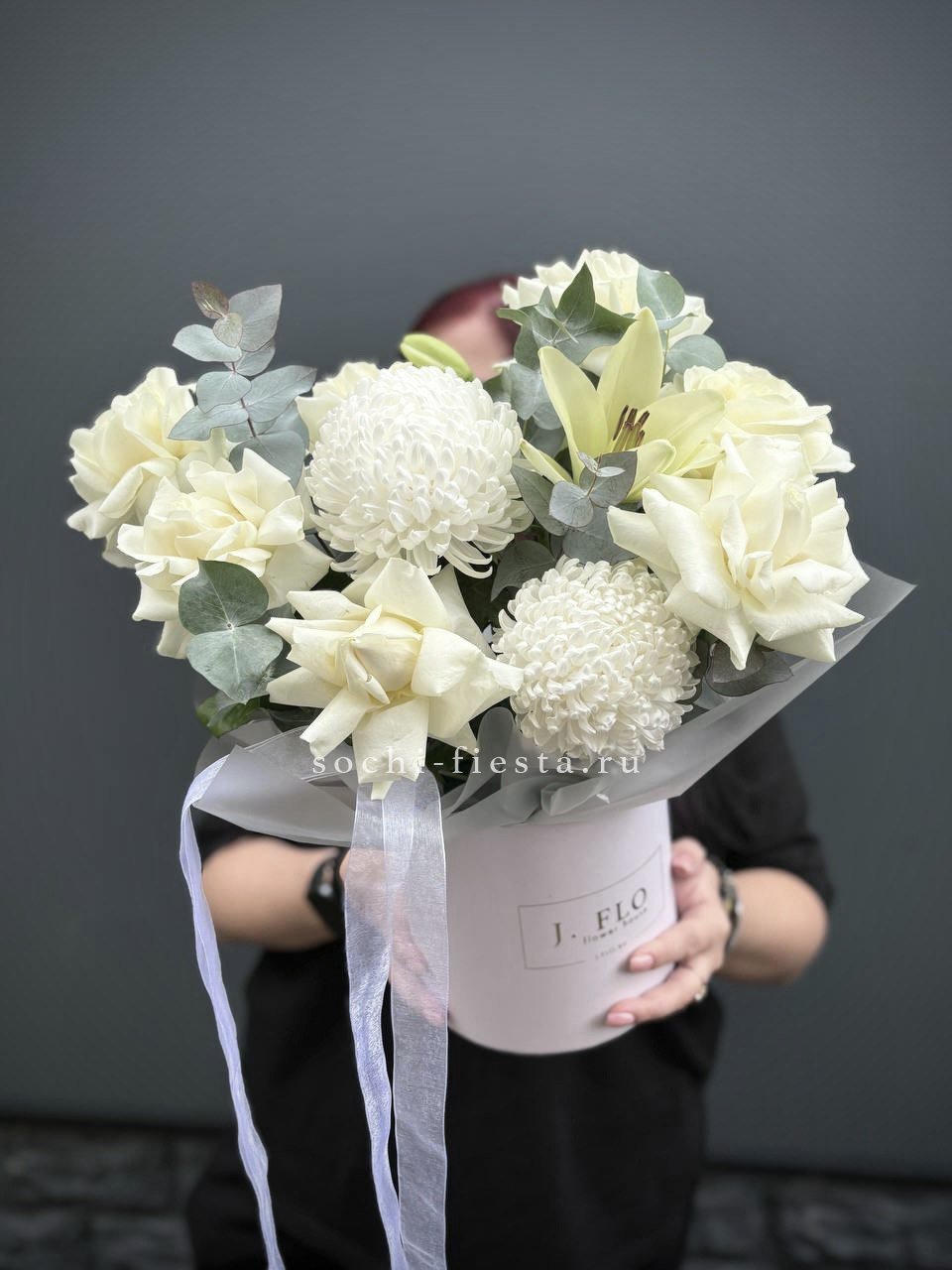 гортензии, эустома, розы, бомбастик, эвкалипт, антиринум в боксе 25.