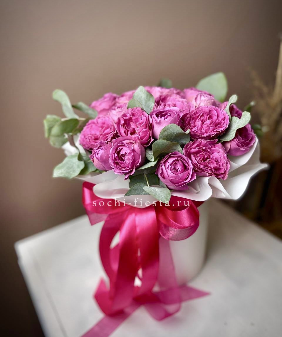 пионовидная кустовая роза бомбастик - 31 веточек, эвкалипт, лента, цилиндр D20.