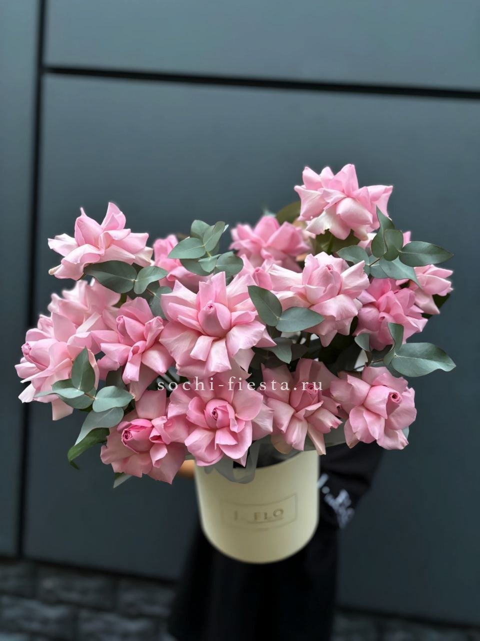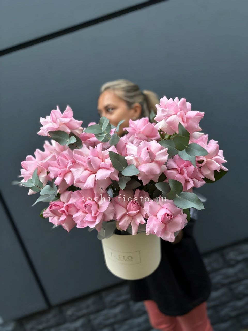 Пышные головки диантуса собраны плотной шапкой в круглой коробке. Ветви эвкалипта создают воздушное обрамление. Минималистичная композиция с выраженной текстурой.