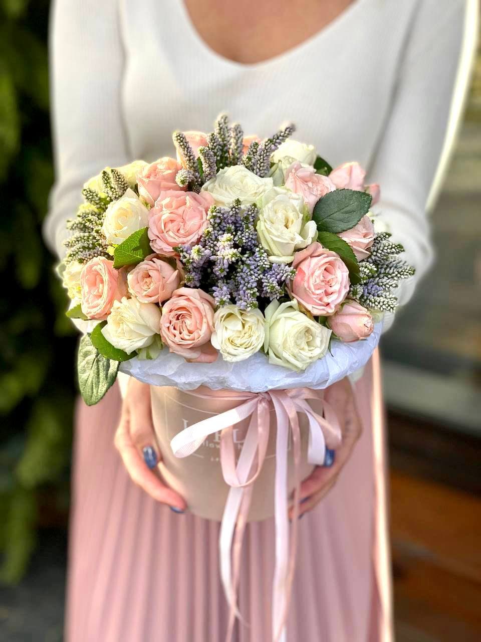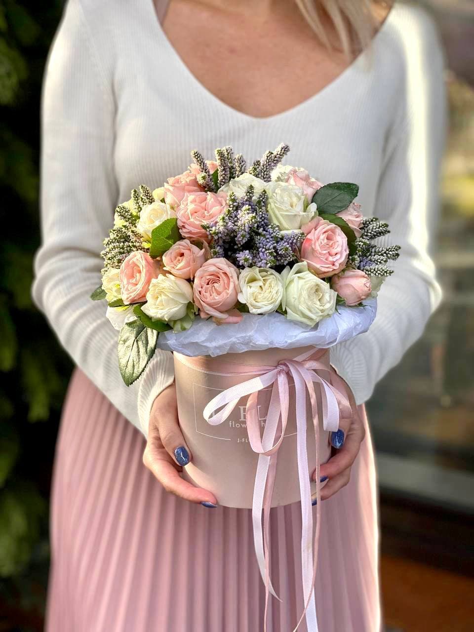 Гортензия создает пышную основу для французских роз и диантусов с эустомой. Цилиндр компактен и не требует дополнительной вазы. Розовая гамма раскрывается слоями от бледных до насыщенных оттенков.