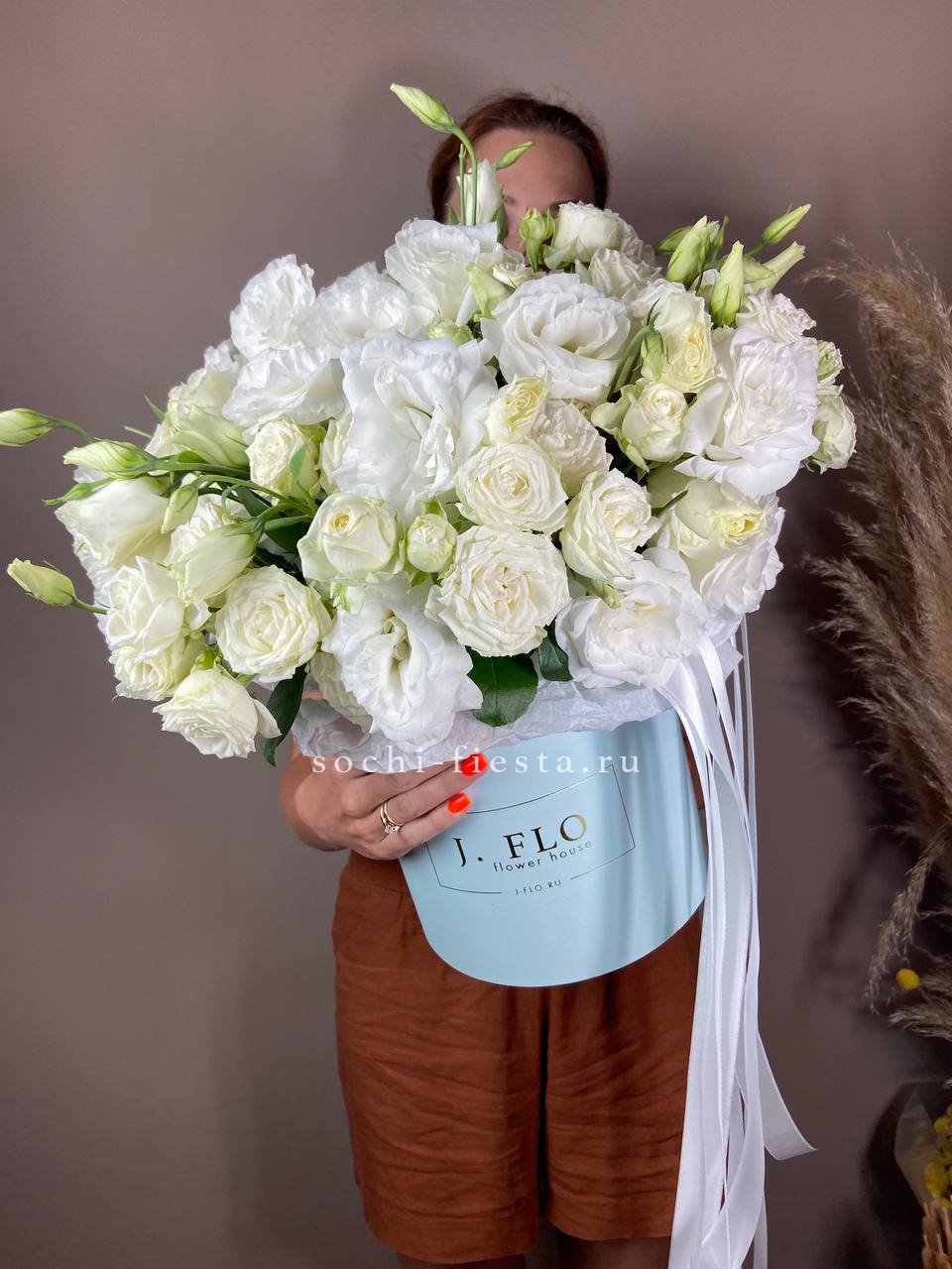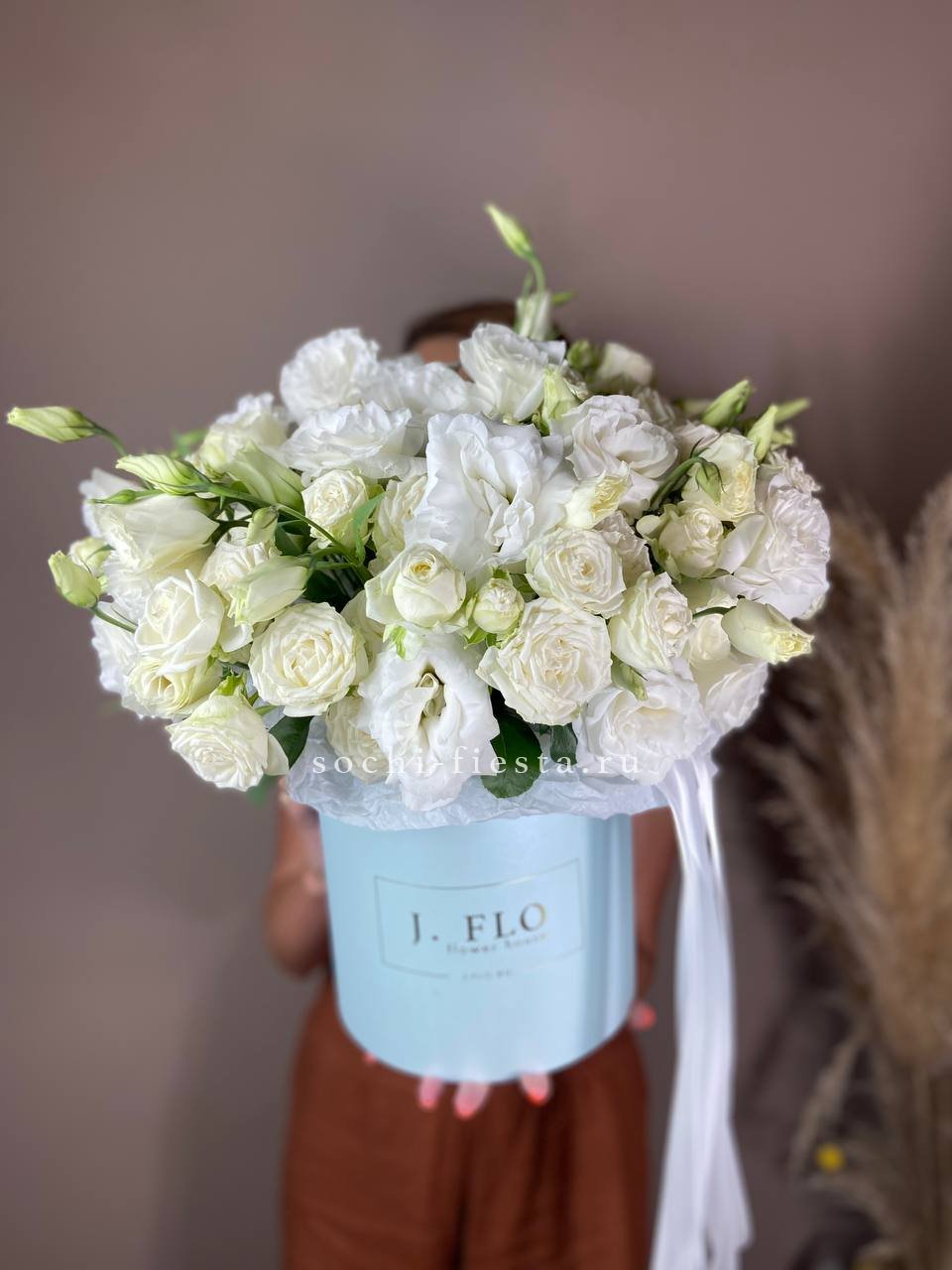 роза, диантус, пионы или гортензия, розы, бомбастик, эустома, декоративная зелень, цилиндр D16.