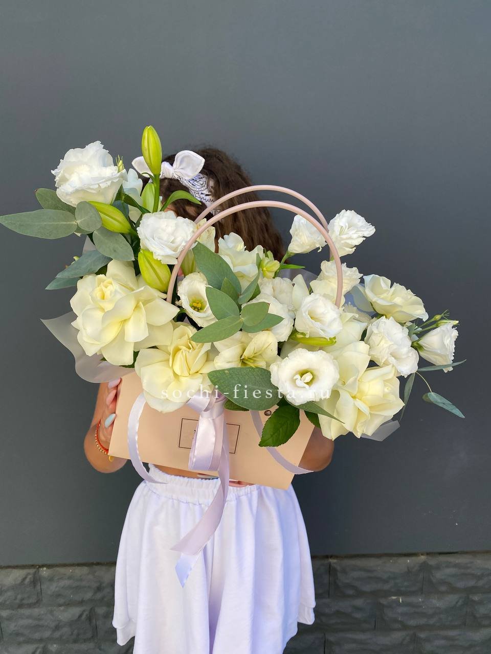 Розовые розы встречаются с орхидеей цимбидиум в объемной сумке-кашпо. Эустома и диантус создают многослойность, а кустовые розы заполняют пространство между крупными бутонами. Композиция держит форму и радует насыщенностью.
