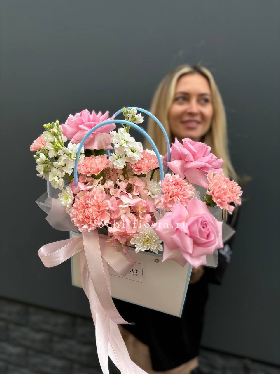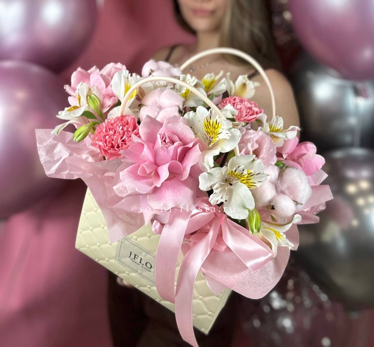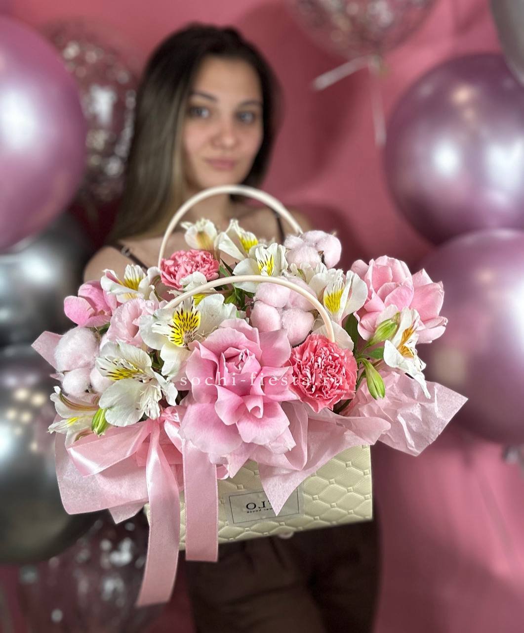 Воздушная композиция из диантусов и альстромерии в удобном формате. Цветы на оазисе держат свежесть долго и не требуют сложного ухода.