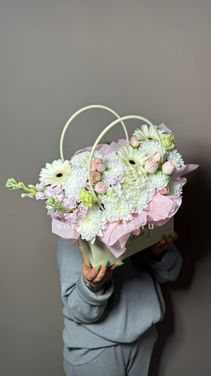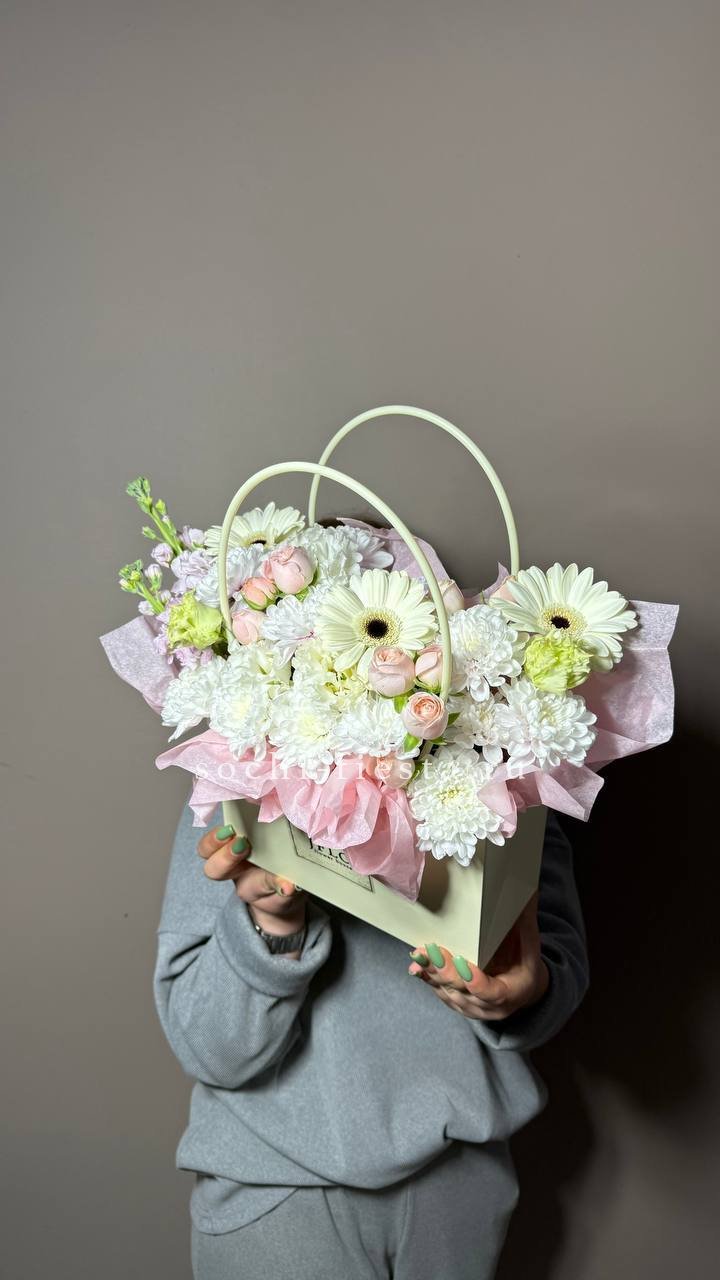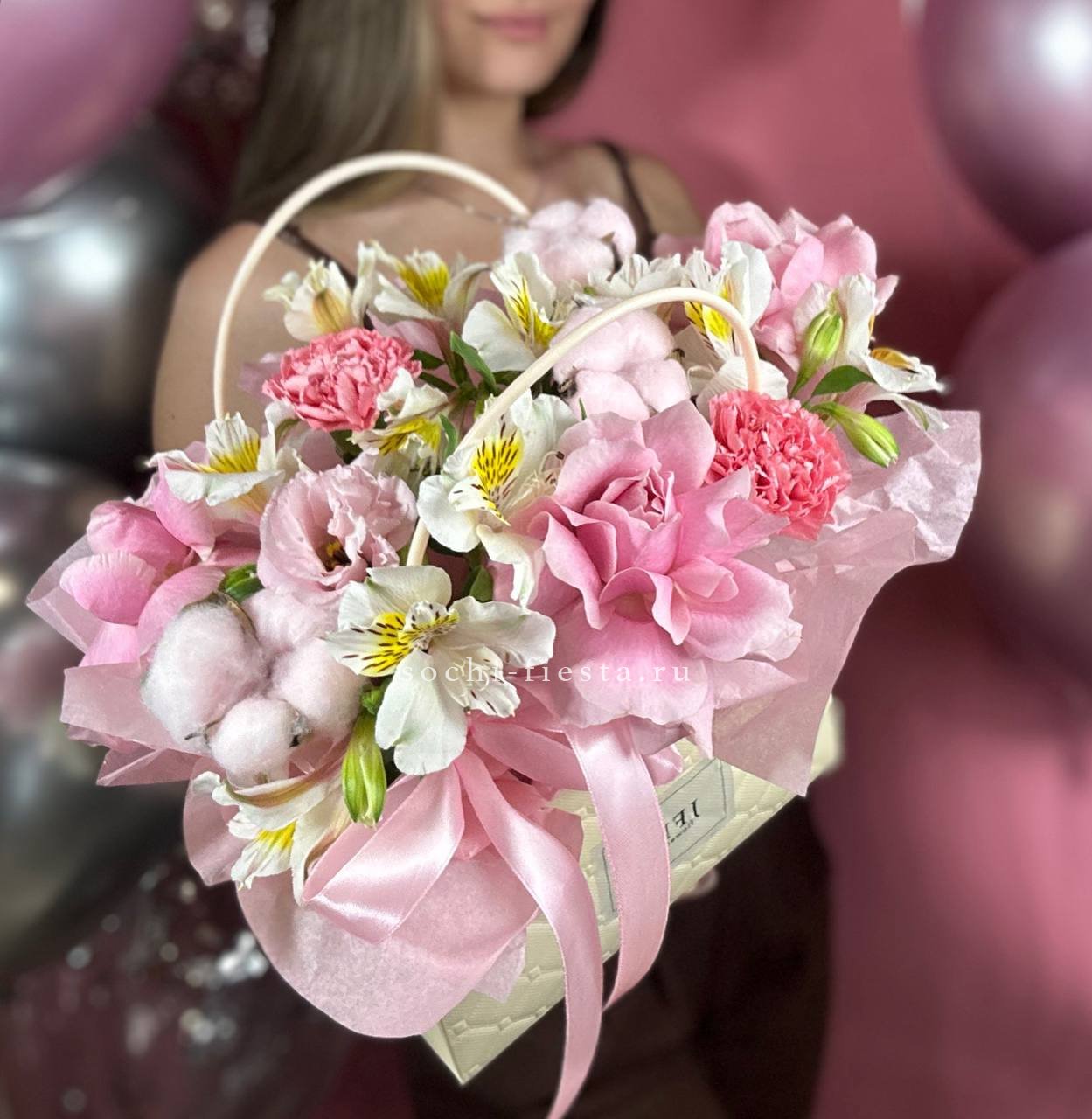 Сумочка Florence дарит ощущение солнечного утра. Альстромерии и розовые розы собраны в легкую композицию с добавлением хлопка и диантусов. Удобная форма позволяет разместить её на столе или подоконнике.