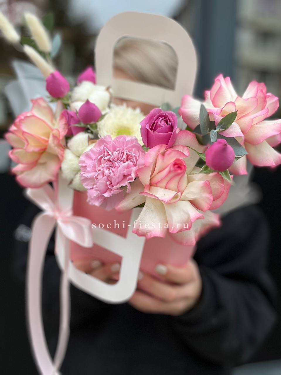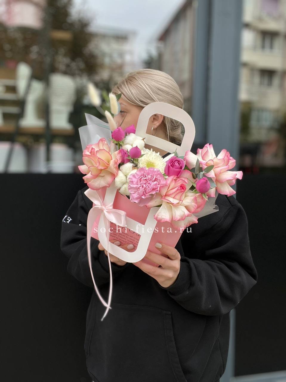 сумочка в нежных тонах из диантусов, роз, гортензий, маттиолы, хризантемы.