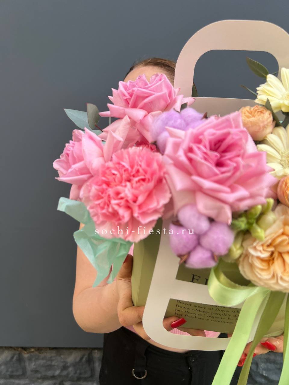 Компактная сумочка в двух оттенках объединяет цветы с мягкими переходами тонов. Форма держится плотно и естественно.