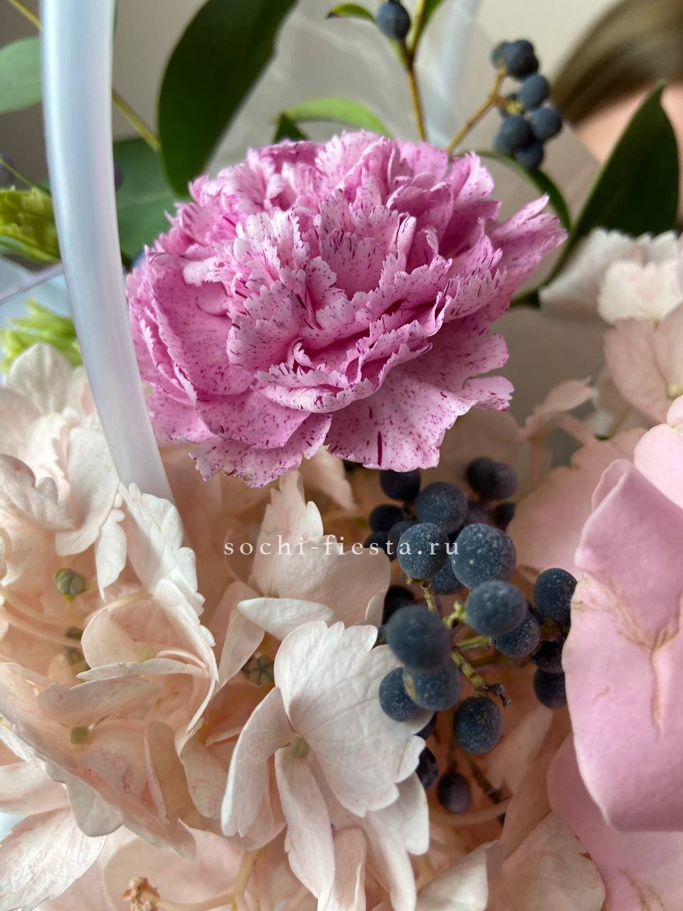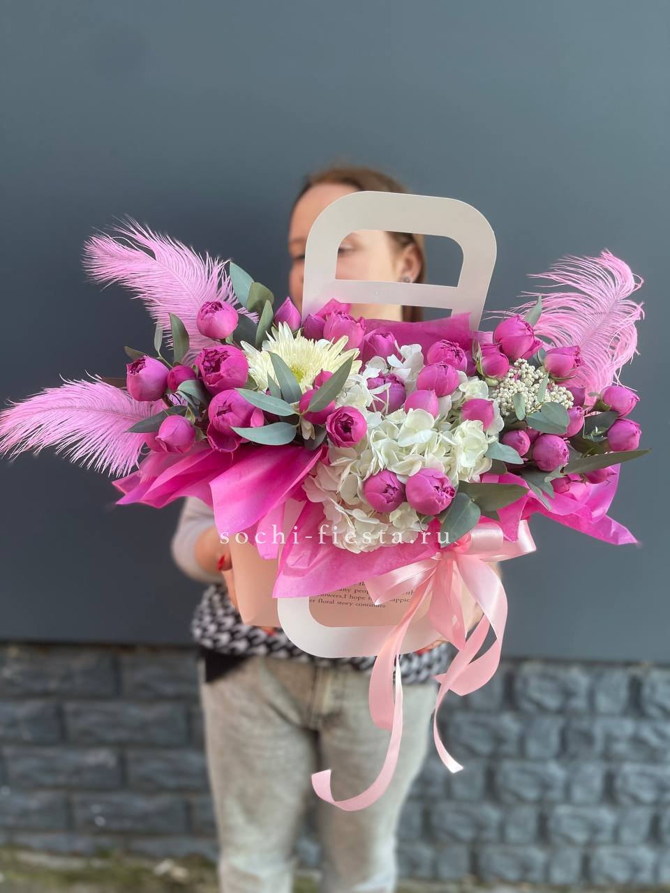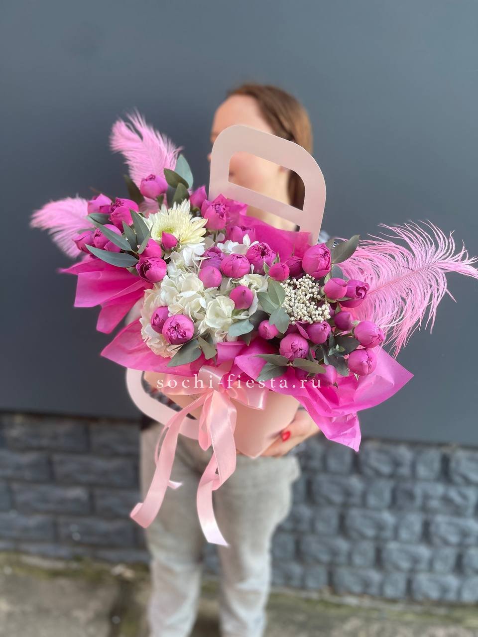 Розовые оттенки переплетаются с солнечными пушистыми шариками мимозы и белоснежным хлопком. Весенняя композиция в удобной сумочке дарит ощущение первых теплых дней и пробуждения природы.