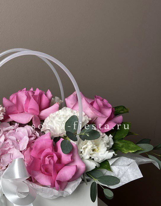 Белые розы и хризантемы сочетаются с воздушной эустомой и хлопком в сумочке. Светлая гамма с прохладным оттенком напоминает морскую свежесть и создает спокойное настроение.