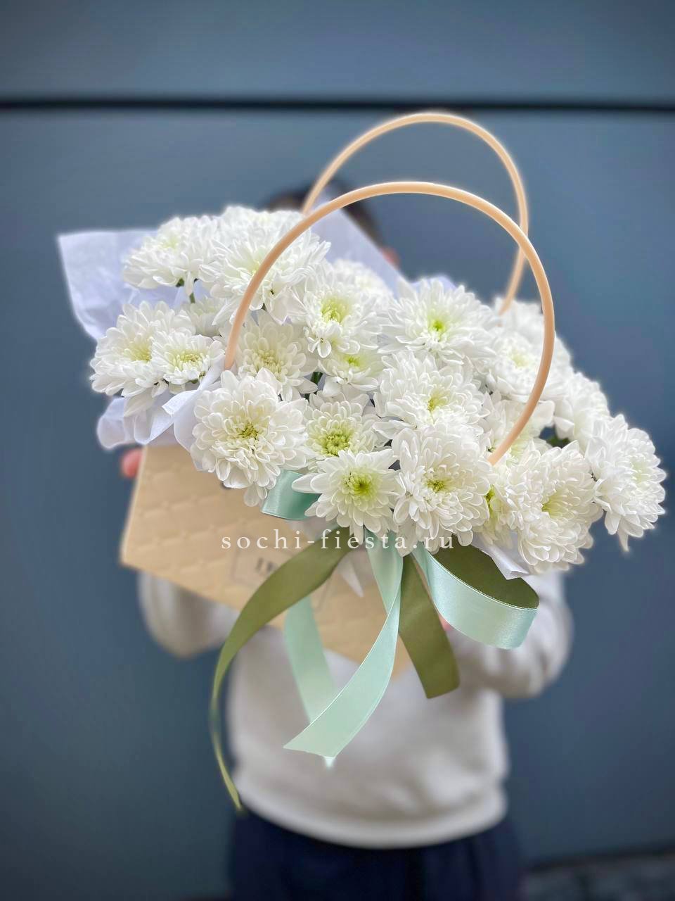хризантема кустовая, лента, сумка-кашпо.